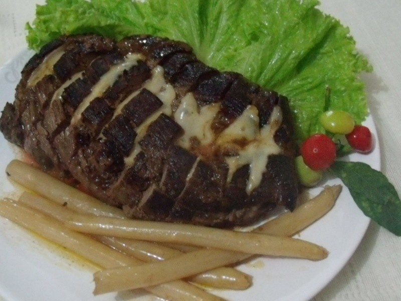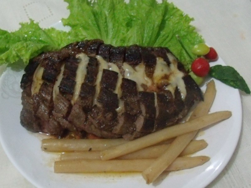 Temperar o filé com alho, sal e pimenta-do-reino. Deixar tomando gosto por 1 hora. Levar ao fogo uma frigideira grande e antiaderente com o azeite e uma colher (sopa) de manteiga. Fritar o filé primeiro de um lado (bem dourado), virar com um pegador ou espátula para não perfurar a carne e dourar bem do outro lado. Retirar da panela, colocar em uma tábua e realizar cortes em sua superfície sem ir até ao fim. Colocar fatias de provolone dobradas ao meio e voltar à panela. Deixar por mais 5 minutos no fogo com tampa (para derreter o queijo). Desligar o fogo, deixar por mais 5 minutos no calor (para corar por dentro) e servir em seguida acompanhado de aspargos passados em um pouco de manteiga, arroz refogado e salada de tomates variados.