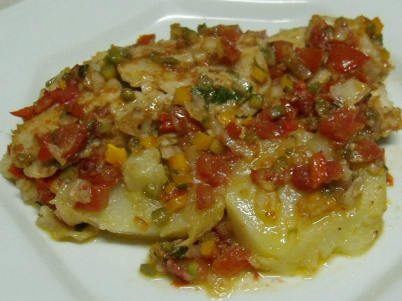 Temperar os filés com alho, sal e pimenta-do-reino a gosto. Reservar. Misturar os tomates, a cebola, os pimentões e o molho de tomate. Temperar com sal e cheiro verde. Reservar. Untar um refratário com azeite e forrar com as batatas pré cozidas e branqueadas (choque térmico). Colocar por cima o peixe e sobre ele, o molho de tomates com as verduras. Regar com bastante azeite e levar ao forno por 40 minutos (cuidado para não secar). Servir com arroz de sua preferência.