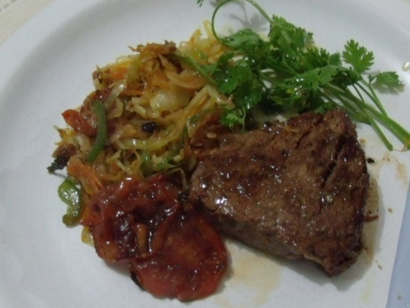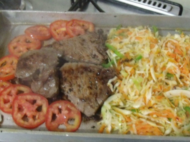 Hoje me deu uma vontade danada de comer aquela verdurinha chinesa na chapa! Acrescentei tomates e acompanhei de tornedores de filé que tinha em casa! Ficou um prato leve e delicioso! Foi o meu jantar!