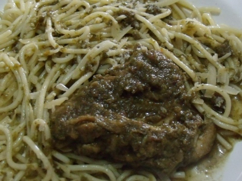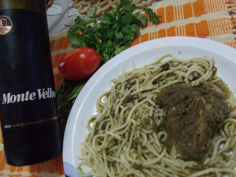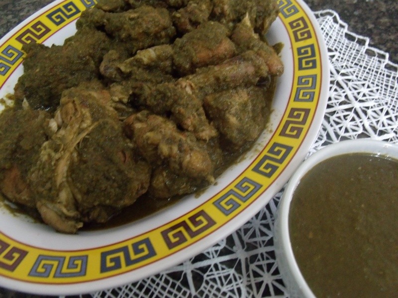 Temperar os pedaços de frango com sal e dourar ligeiramente no óleo. Reservar fora da panela. Bater no liquidificador os tomates, as cebolas e o alho. Levar ao fogo na panela em que dourou o frango e refogar até engrossar um pouco. Reservar na panela. Passar o coentro no liquidificador com a água, o cominho e as pimentas. Juntar esse molho à panela. Acrescentar o frango e deixar em fogo brando até ficar bem macio. Provar o sal. Servir acompanhado de talharim ou espaguete, com o próprio molho do frango e queijo ralado à parte.