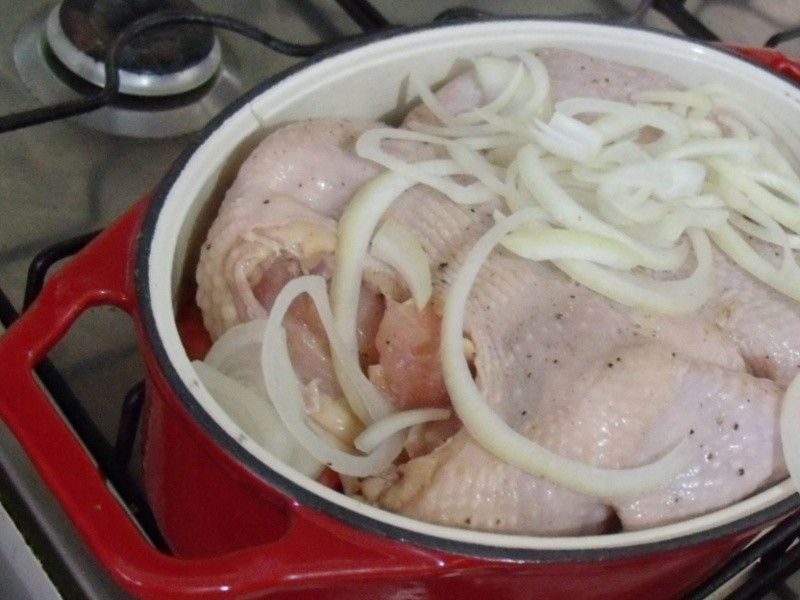 Após uma manhã de trabalho, em pleno domingo, chego em casa e meu irmão me aparece com um frango inteiro desossado e uma bateria de temperos! Fomos pra cozinha e aos poucos foi surgindo essa receita, que resultou em um maravilhoso ensopado! Com sua teimosia em utilizar a sua chique caçarola de ferro, que mal coube o frango que era muito grande, ao longo do processo tivemos que passar tudo para minha querida panela de 12 litros!