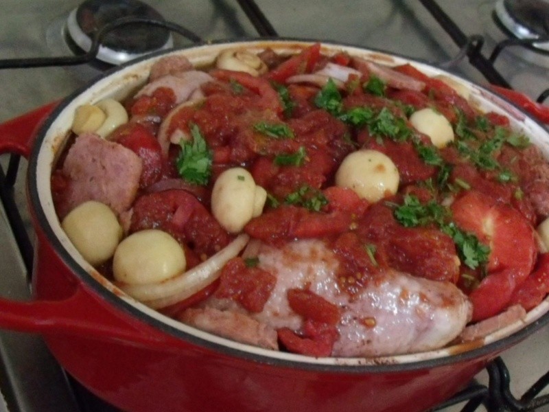 Nota: Não se “aperreie” se você não tiver todos os ingredientes! Substitua por outro de sua preferência, pois o principal desse prato é o molho de tomate com cebolas, batatas, vinho tinto e o amor com que você o prepara!
