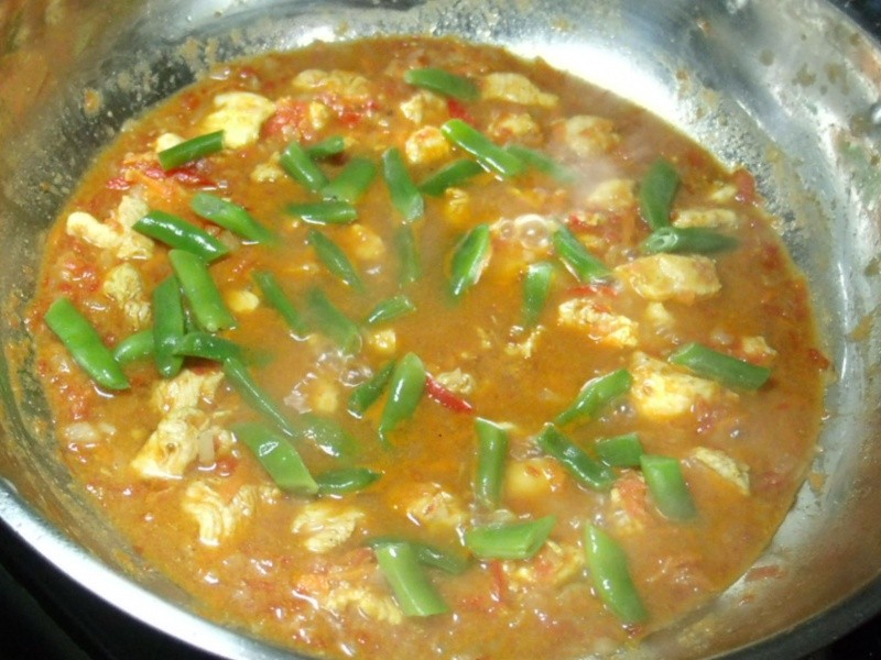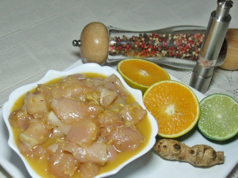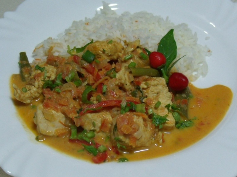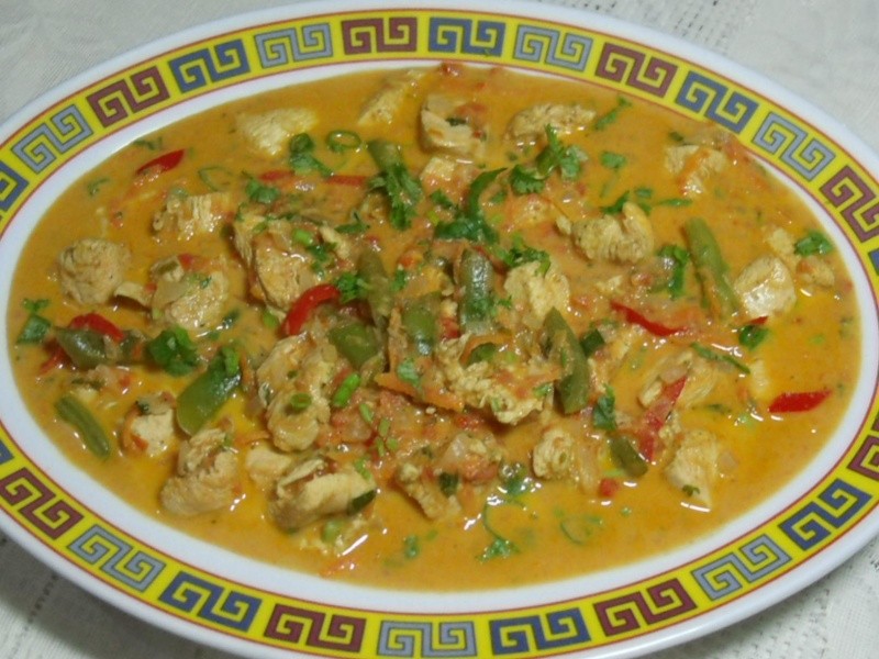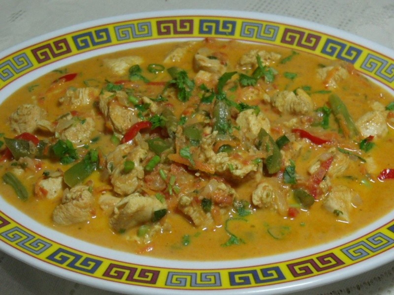 Lavar bem o frango com o limão, escorrer e temperar com gengibre, sal e pimenta-do-reino a gosto. Acrescentar o suco de laranja e reservar para tomar gosto. Levar ao fogo uma Wok, colocar o azeite e refogar o alho e a cebola. Juntar o pimentão vermelho, a cenoura e a pimenta. Refogar mais um pouco. Acrescentar o frango reservado com todo o seu líquido. Refogar por uns 10 minutos e colocar os tomates batidos no liquidificador com 1/2 xícara de água, o caldo de legumes em pó, o molho de tomate caseiro e o açúcar. Adicionar o molho inglês e cozinhar em fogo médio até que o frango esteja cozido. Incorporar as vagens e deixar por mais 2 minutos tomando gosto. Acrescentar o leite de coco misturado com o amido e por último o curry e a metade do coentro e cebolinha. Ferver por 1 minuto, colocar em uma travessa e polvilhar o restante do coentro e cebolinha. Servir acompanhado de arroz branco e partir para o abraço.