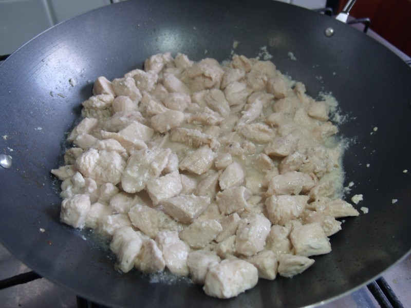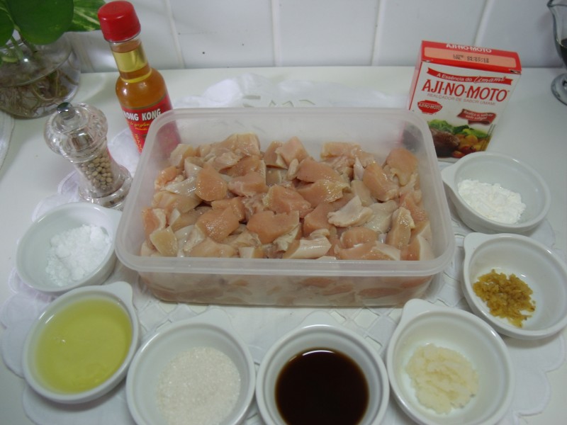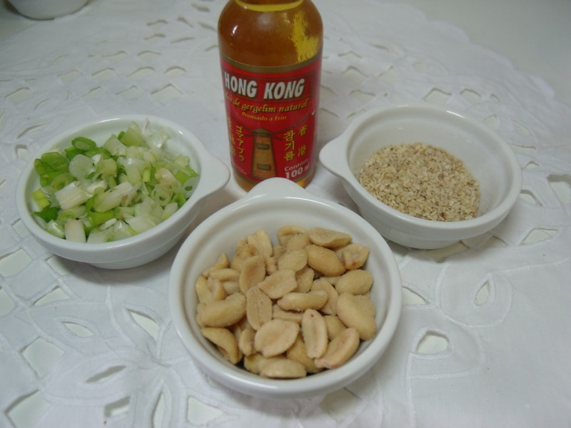 Nota: na receita original, o amendoim é crú, devendo ser frito no óleo e depois reservado. Na mesma panela, fritar o frango. Optei pela praticidade do amendoim já torrado.