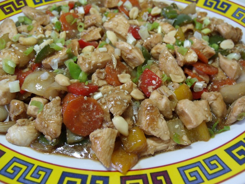 Cortar o frango em cubinhos, colocar em uma tijela e acrescentar todos os ingredientes do tempero. Misturar bem com as mãos e reservar na geladeira por 15 minutos. Em um recipiente fundo, colocar todos os ingredientes do molho, misturar bem e reservar. Cortar a cebola e os pimentoões em cubos (descartando as sementes e as partes brancas do seu interior) e reservar. Picar os talos de cebolinha e reservar. Cortar a cenoura em rodelas finas e cozinhar ligeiramente no vapor, apenas para amaciar um pouco. Reservar. Em uma Wok, colocar 2 colheres (sopa) de óleo (ou azeite) e refogar os pimentões, a cenoura e a cebola, até que esta fique ligeiramente transparente. Colocar em um recipiente e reservar. Na mesma panela, adicionar mais um pouco de óleo e fritar o frango com todo o seu tempero até que fiquem branquinhos, sem deixar dourar. Juntar as verduras ao frango e acrescentar o molho reservado. Incorporar o óleo de gergelim e o amandoim (reservar alguns para a decoração do prato). Mexer delicadamente e colocar em uma travessa apropriada. Polvilhar o gergelim torrado, a cebolinha verde e acrescentar alguns amendoins para decorar. Servir com um arroz de sua preferência.
