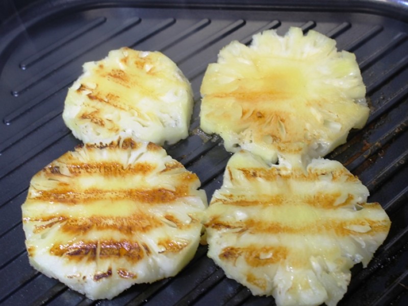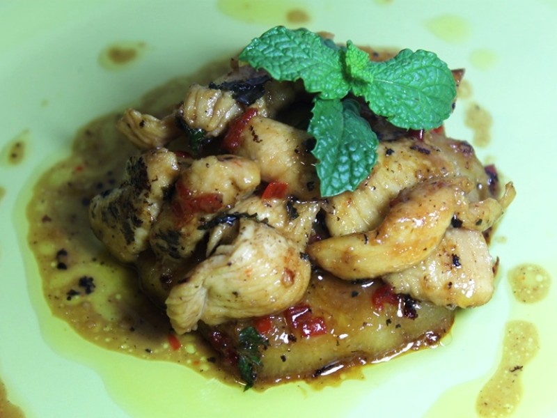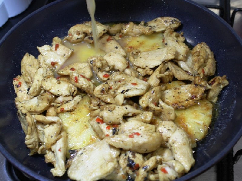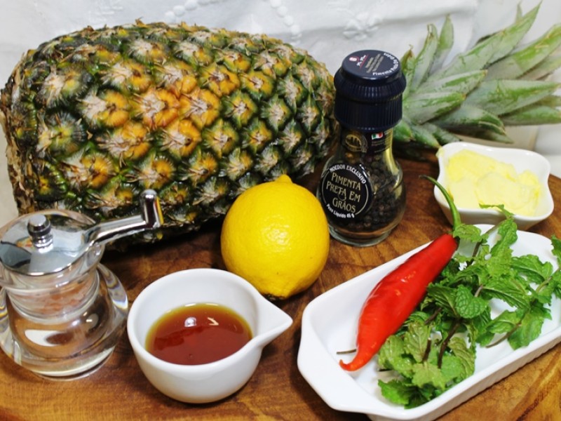 Temperar as iscas de frango com o limão siciliano, o mel, a pimenta dedo de moça, a pimenta-do-reino e o azeite. Reservar. Dourar as rodelas de abacaxi numa chapa canelada e em seguida passar para uma panela com a manteiga para cozinhar um pouco (fogo baixo). Com uma escumadeira, retirar o frango da marinada (reservar a mesma) e fritar em panela quente (de preferência de ferro). Em seguida, juntar ao abacaxi, despejar a marinada reservada, temperar com sal rosa moído na hora (ou sal normal) e crescentar o hortelã picado. Montar os pratos individuais com uma rodela de abacaxi no centro e sobre ela uma porção das iscas de frango. Decorar com um raminho de hortelã.