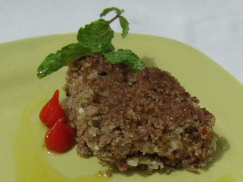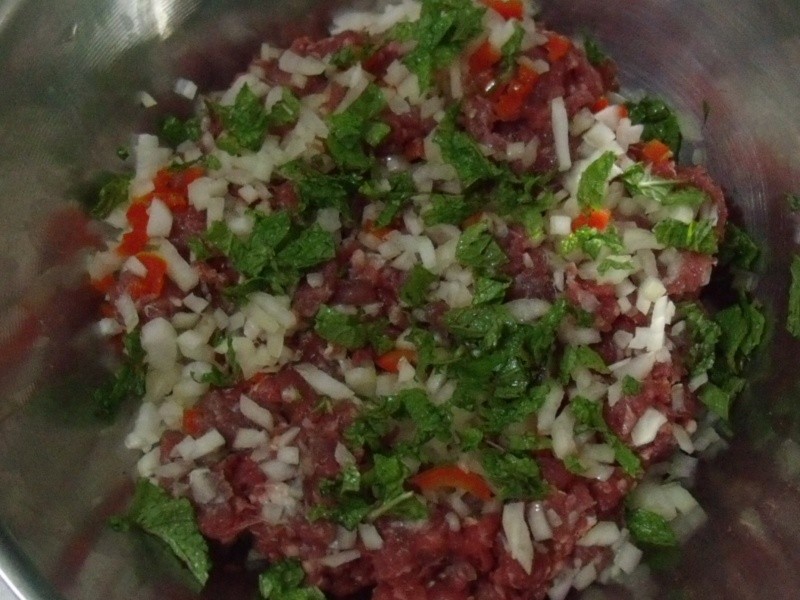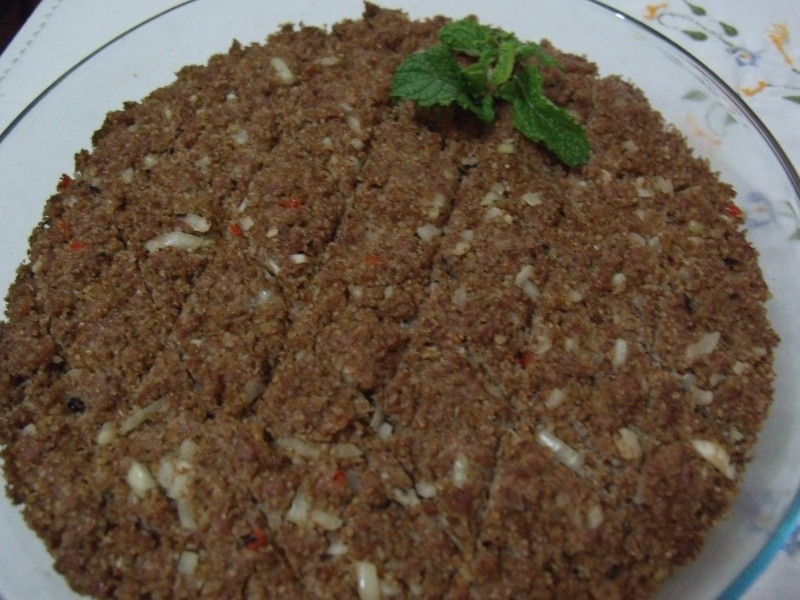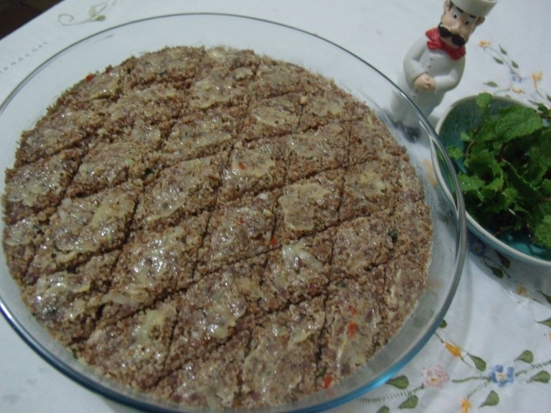 Colocar o trigo em água fria por 1 hora. Após esse tempo, espremer eliminando a água (se necessário). Colocar numa tijela e misturar a carne moída, o sal, a pimenta síria, o pimentão vermelho, a hortelã, a cebola e o alho. Amassar bem para misturar todos os ingredientes. Untar uma assadeira com margarina, colocar a metade da massa, espalhar o requeijão e por cima a outra metade. Molhar uma faca sem corte e fazer losangos na massa. Espalhar a manteiga com um pouco de azeite e levar ao forno quente para assar, por aproximadamente 20 minutos. Decorar com folhas de hortelã e servir com limão e azeite.