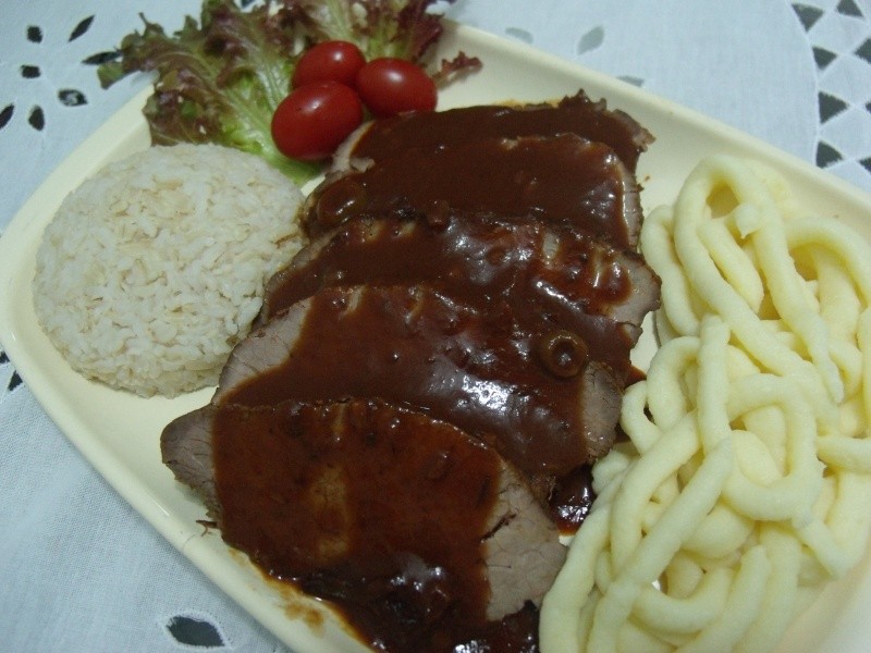 Numa panela de pressão destampada, dourar a carne na sua própria gordura, virando-a sempre que necessário para que adquira um dourado uniforme. Em um recipiente, misturar o restante dos ingredientes, adicionar a carne (já dourada), tampar a panela e após atingir pressão, cozinhar por 30 min. Retirar a carne da panela e deixar esfriar (reservar o molho). Fatiar finamente com uma faca elétrica (se não possuir uma, utilize uma faca bem amolada) e arrumar em um prato apropriado. Quando for servir, basta aquecer o molho, regar a carne e acompanhar com purê de batatas e arroz refogado ou uma massa de sua preferência. Decorar a gosto.