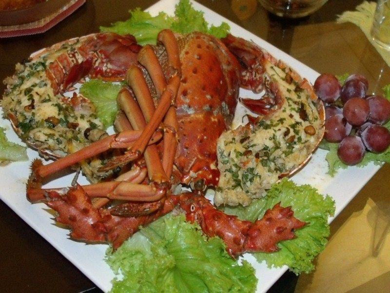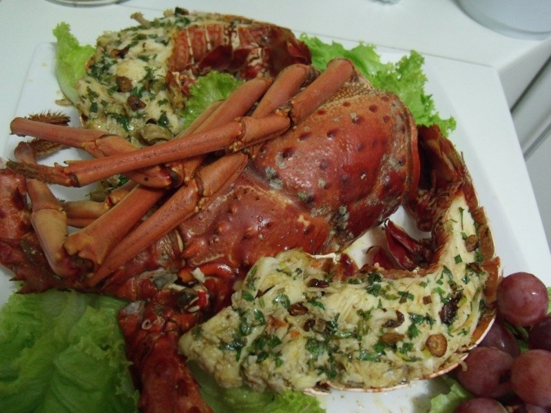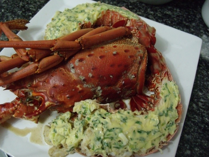 Lavar bem a lagosta e levar ao fogo com água e sal. Deixar cozinhar até que ela fique bem vermelha. Partir ao meio, retirar a tripinha e reservar (separar a cauda da cabeça). Misturar a manteiga com todos os ingredientes e colocar sobre a cauda da lagosta. Levar ao forno para derreter a manteiga. Colocar em uma travessa e servir com o molho de alho. Decorar com folhas de alface e com a própria cabeça da lagosta.