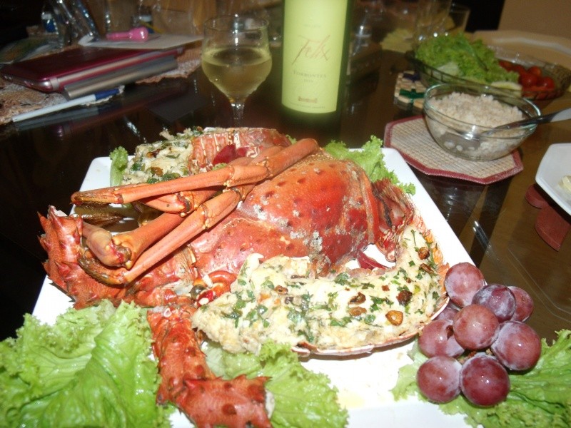 Esta lagosta enorme, veio de Alagoas pra São Paulo, ocupando sozinha um isopor! Pesava mais de 4 k e deu trabalho para ser partida ao meio. Tivemos que pedir emprestado uma panela grande para cozinhá-la. Observem a foto, quase não cabia na pia! Coloquei um garfo ao lado para vocês terem uma ideia do tamanho dela. A receita pode ser feita com lagostas menores, o importante é o molho a ser utilizado. Aqui, fiz um molho simples e muito gostoso. Degustamos acompanhada de um maravilhoso vinho branco, que o meu genro ganhou de presente de aniversário. Delícia de jantar!
