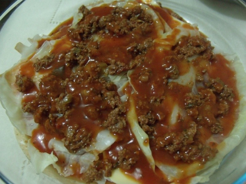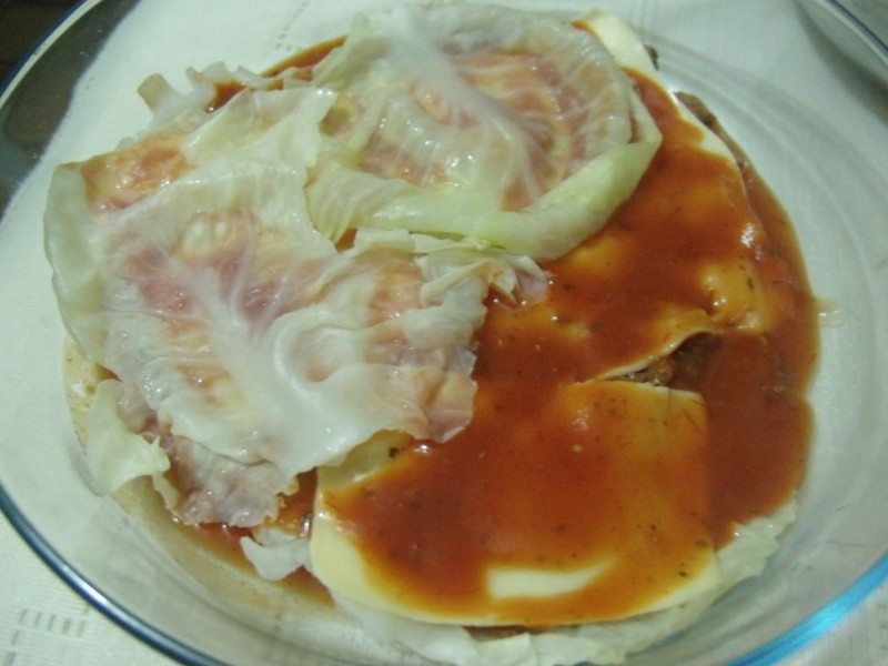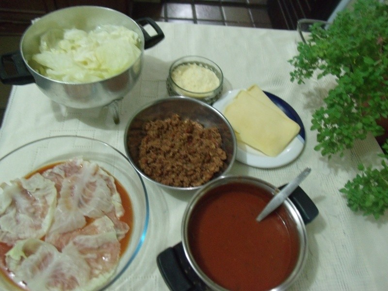 Colocar as folhas de repolho no vapor, o tempo suficiente para amolecer (cozinhar no vapor mantém as propriedades nutriciona dos legumes). Reservar. Em um pirex refratário, colocar um pouco de molho de tomate, uma camada de repolho, e por cima, um pouco de carne moida. Regar com molho de tomate e cobrir com o queijo mussarela e mais um pouco de molho. Repetir as camadas, sendo a última de queijo mussarela com molho de tomate e polvilhada de queijo ralado. Levar ao forno para gratinar. Servir como prato principal, acompanhado de pão ou torradas.