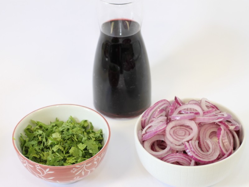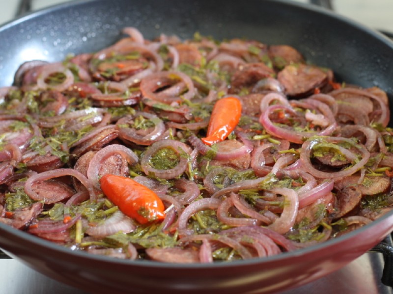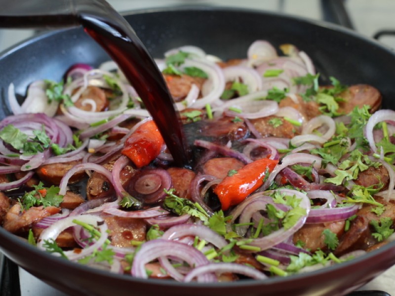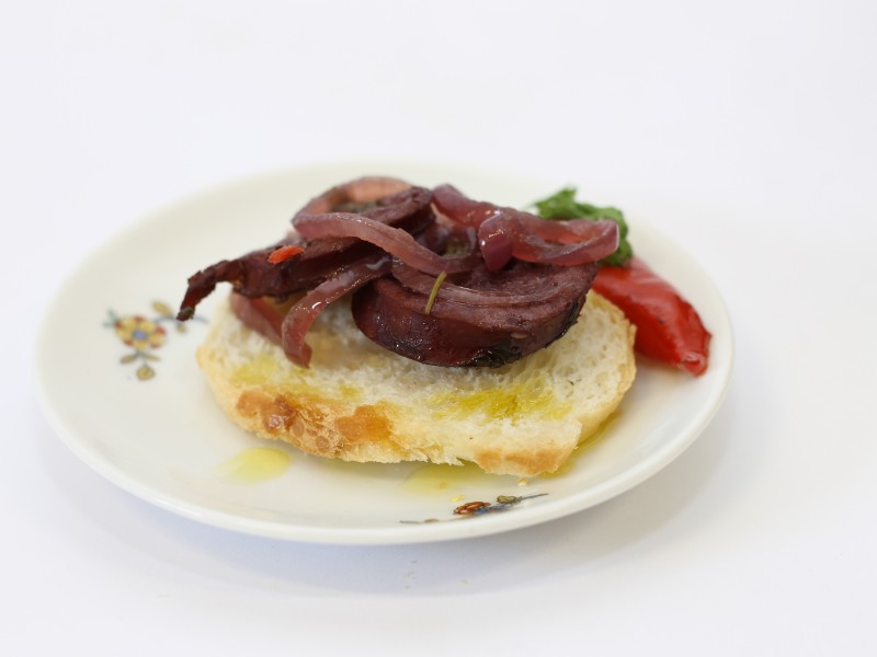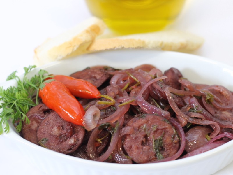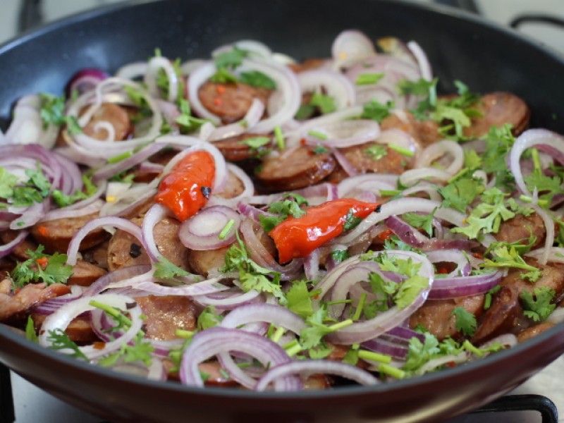 Escaldar as linguiças para retirar o excesso de gordura, lavar e cortar em rodelas não muito finas. Levar ao fogo uma panela com o azeite, refogar o alho e acrescentar as linguiças. Refogar até que comecem a dourar. Incorporar as pimentas, as cebolas e o coentro. Refogar mais um pouco (acrescentar mais azeite se achar necessário) e colocar o vinho tinto. Baixar o fogo e deixar cozinhar até que as cebolas estejam macias. Servir acompanhadas de pão francês em rodelas e um bom azeite extra virgem.