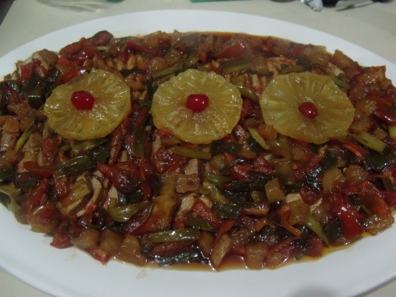 Temperar o lombo (ou costela) com sal e pimenta-do-reino a gosto. Fritar com um pouco de óleo e reservar. Em uma frigideira grande, colocar 6 colheres (sopa) de óleo, deixar esquentar e passar ligeiramente os tomates, o pimentão e a cebolinha. Reservar. Nessa mesma frigideira, colocar o ketchup, o vinagre branco, o molho de soja, a calda, os cubinhos do abacaxi e açúcar a gosto. Ferver durante 5 min e juntar as verduras. Colocar o lombo (fatiado fino) ou a costela (já cortadinha) em uma travessa e despejar o molho por cima. Decorar com as 3 rodelas de abacaxi em calda sem os miolos e colocar as cerejas em seu lugar.