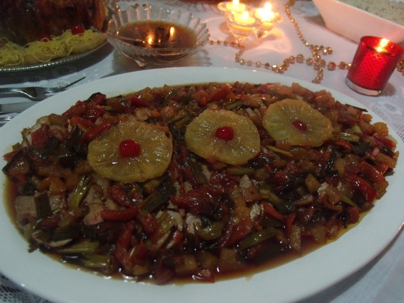 Esta é uma receita peruana de um curso que fiz há muitos anos. Fica um prato colorido e delicioso. Como predominam as cores verde e vermelha, já esteve presente algumas vezes na minha Ceia de Natal. Tem um sabor agridoce, semelhante a uma receita chinesa. Vale a pena experimentar!