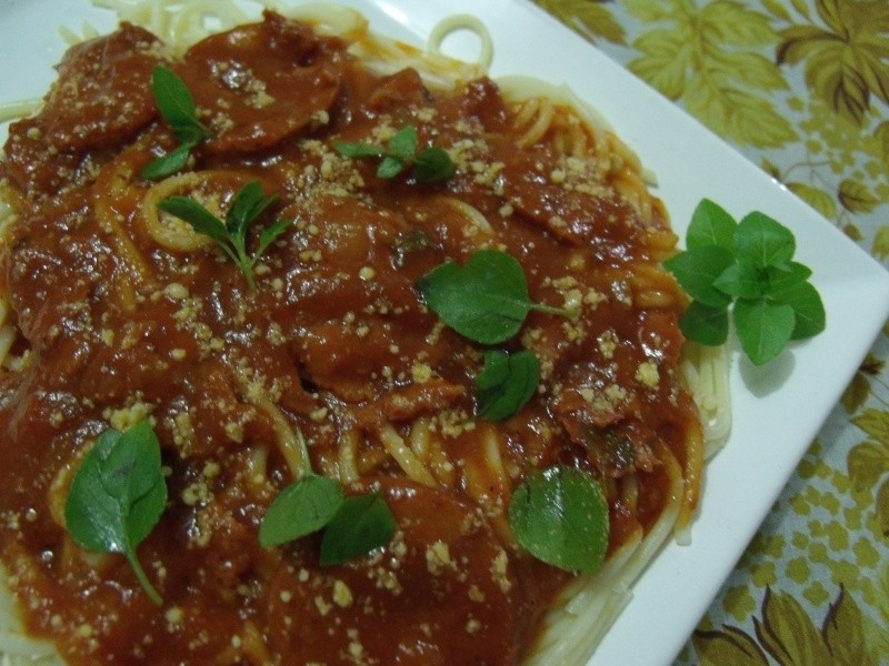 Cozinhar o macarrão al dente, conforme a instrução da embalagem. Fatiar os paios bem finos e refogar no azeite, com a cebola e o alho. Acrescentar o molho de tomate, a metade do manjericão e deixar por uns 10 minutos em fogo baixo (mexer de vez em quando). Levar o macarrão à uma travessa, colocar o restante do manjericão e polvilhar queijo ralado. Servir imediatamente.