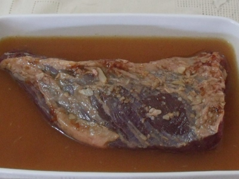 Colocar a maminha em um refratário e temperar com todos os ingredientes. Deixar por um bom tempo tomando gosto e levar à brasa sempre regando com o molho até o ponto desejado (bem ou mal passada). Aqui fiz no forno, pois era dia de semana e não tive coragem de fazer churrasco. Nesse caso, colocar a metade do molho, levar ao forno alto por 50 minutos, sempre regando de vez em quando com o restante do molho. Acompanhar de arroz refogado, salada e farofa de soja (ver site).