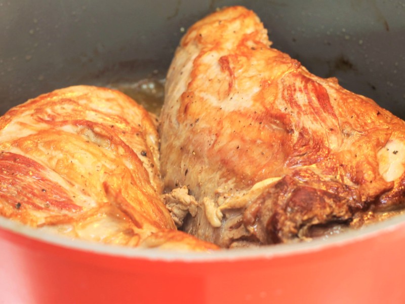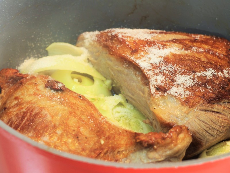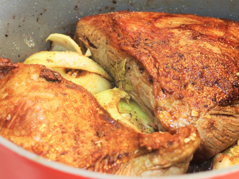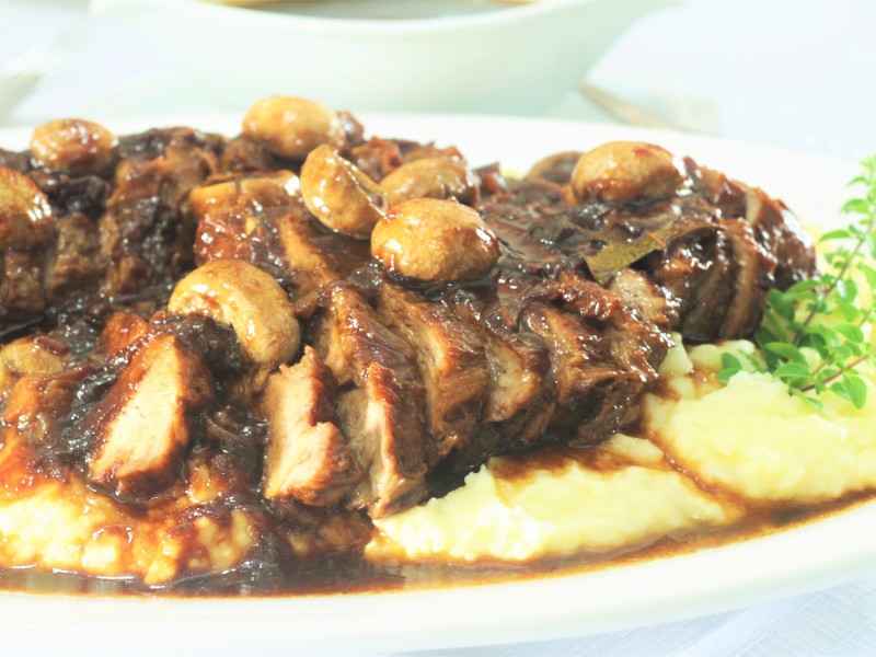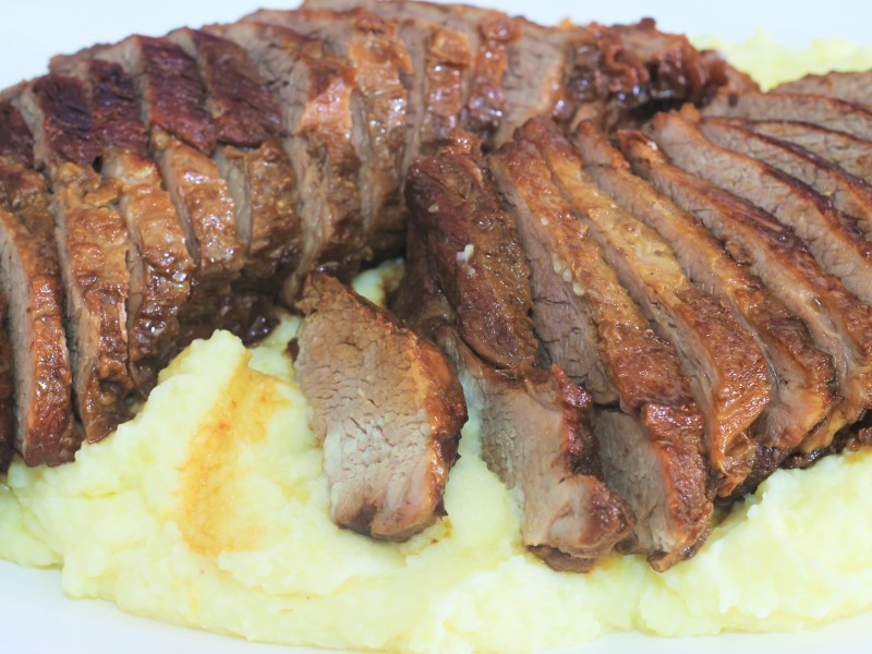 Nota: aqui as fatias das maminhas foram colocadas sobre um purê de batatas, mas também cairiam muito bem sobre um purê de macaxeira ou mandioquinha!