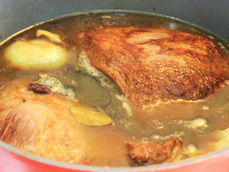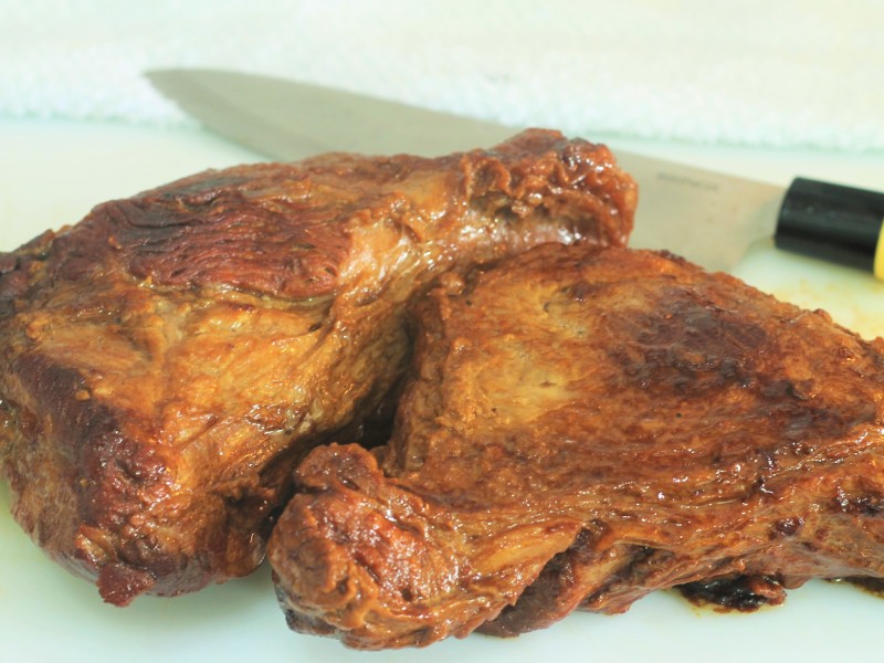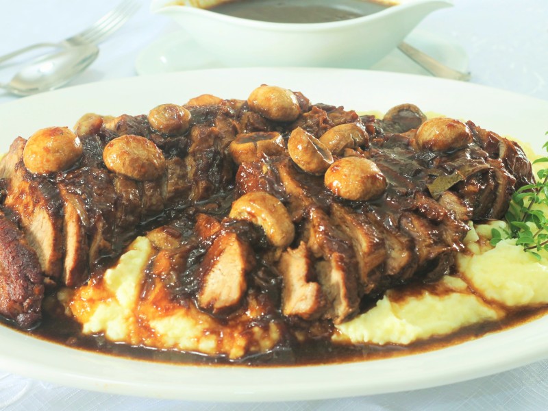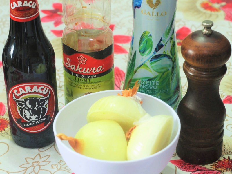 Em uma panela grande e de preferência antiaderente, colocar o azeite, as cebolas emborcadas, o alho picadinho, o açúcar e as maminhas. Dourar bem um lado das maminhas e depois dourar o outro lado. Acrescentar o shoyu, as folhas de louro e água suficiente para cobrir a carne. Cozinhar em fogo brando por aproximadamente 1 h e 45 minutos. Retirar as maminhas e reservar. Passar o molho por uma peneira grossa, voltar à panela e despejar aos poucos a farinha de trigo diluída na água e mexer até formar um molho encorpado e brilhante. Acrescentar a garrafinha de cerveja preta e os cogumelos paris. Cozinhar por uns 5 minutos e reservar. Forrar uma travessa com um cremoso purê de batatas, colocar as maminhas fatiadas e despejar o molho por cima (reservar um pouco para servir à parte numa molheira). Decorar com um galhinho de orégano fresco e servir acompanhada de arroz refogado.
