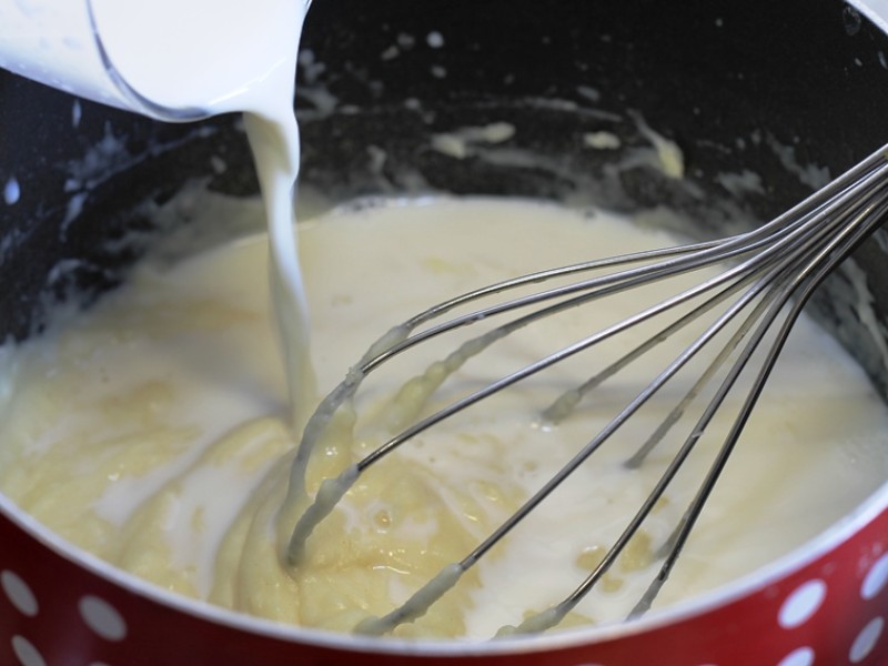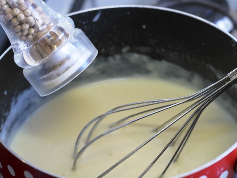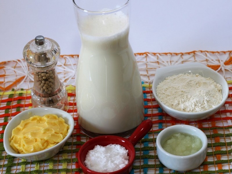 Levar ao fogo a manteiga e a cebola, refogar um pouco e acrescentar a farinha de trigo. Deixar dourar sempre mexendo com colher de pau para não empelotar. Acrescentar agora o leite quente aos poucos sem deixar de mexer (o ideal é utilizar um fuê). Quando engrossar, verificar o sal e juntar a pimenta-do-reino.