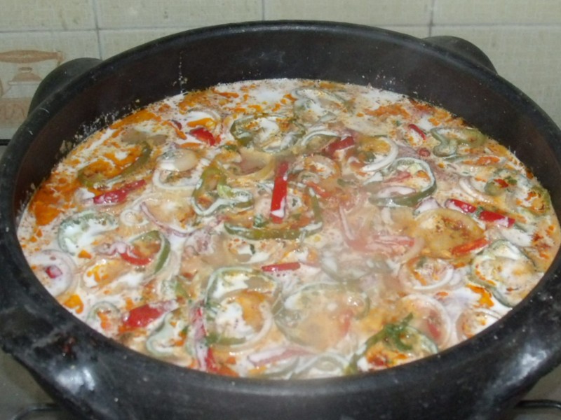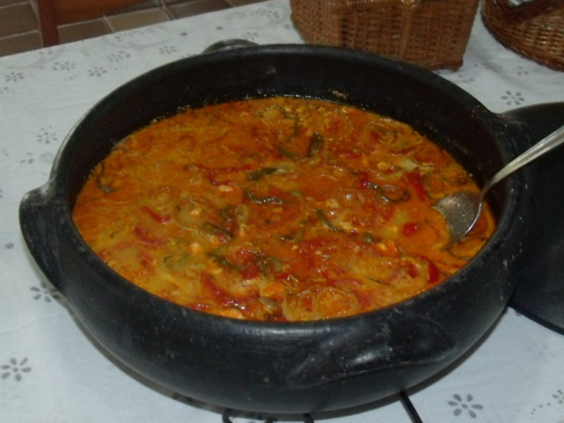 A Moqueca é preparada de diversas maneiras por esse Brasil afora. Em Alagoas é praticamente uma peixada, pois muitos utilizam apenas leite de coco. Na Bahia, usam bastante dendê e no Espírito Santo, apenas o óleo de urucum. Eu utilizo os três. Faço o meu próprio óleo comprando sementes de urucum e deixando no óleo de soja por seis meses. Depois é só coar em papel filtro. O dendê, prefiro usa o artesanal que ganho de amigos da Bahia e sempre em pouca quantidade pois ele é muito forte. Ao final, faço um samba do criolo doido e fica um escândalo! Aqui utilizei a minha maior panela de barro (40 cm de diâmetro), pois foi feita para um grupo de amigos da Comissão da Orla de Maceió. Confraternização de Natal em minha casa.