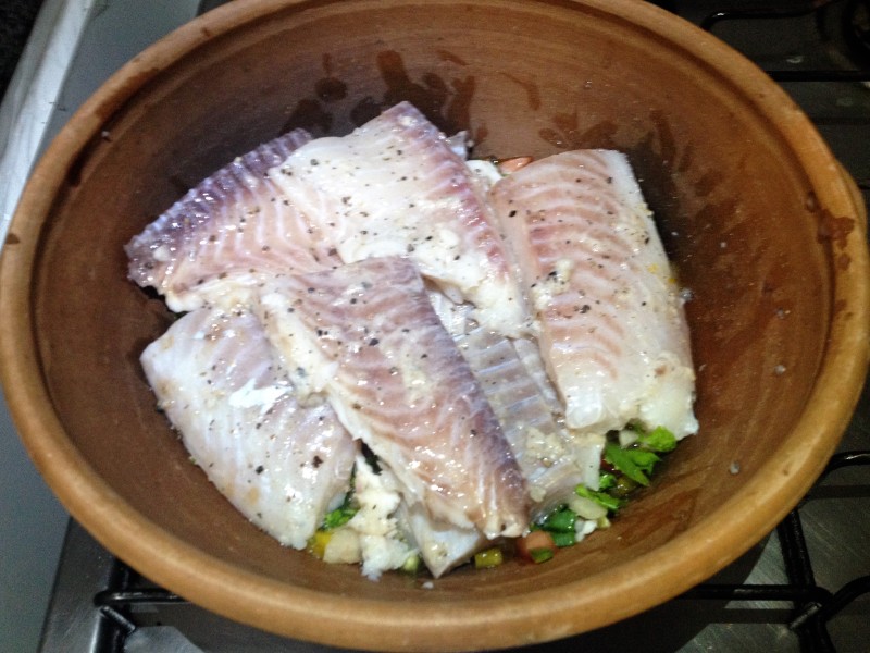 Temperar os filés de tilápia com limão, alho, sal e pimenta-do-reino. Reservar. Colocar a panela de barro em cima do fogão e começar a montar a moqueca. Por na panela o óleo de urucum e o azeite extra virgem (reserva um pouco para a finalização). Por cima, as verduras picadas e a metade do coentro e da cebolinha. Colocar agora os filés e sobre eles as camadas de tomate, cebola, pimentão, pimenta de cheiro picadinha ou em rodelas e o restante do coentro e cebolinha. Temperar com mais um pouco de sal (uso o rosa) e pimenta-do-reino. Regar com azeite, óleo de urucum, leite de côco com o açafrão dissolvido e o molho de tomate caseiro. Tampar a panela e cozinhar em fogo moderado por 20 minutos aproximadamente. Servir imediatamente para que a moqueca vá à mesa ainda borbulhando, é o seu diferencial. Acompanhar de farofa de manteiga e arroz refogado. Bom apetite!