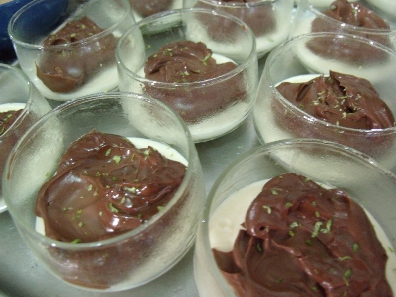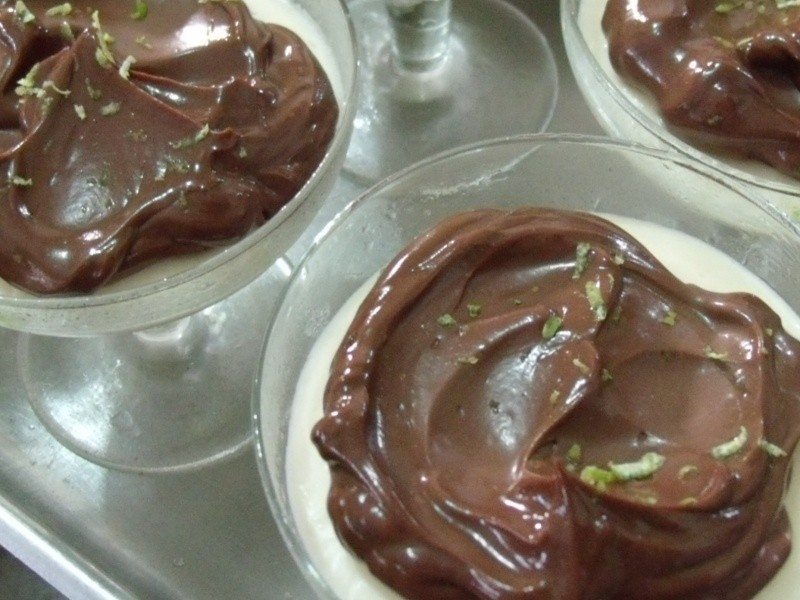 Levar o chocolate ao fogo em banho-maria, retirando assim que derreter para que ele não perca o brilho. Incorporar o creme de leite, misturar bem e deixar esfriar. Colocar por cima do mousse (em cada tacinha) e decorar com raspas de limão. Levar à geladeira até a hora de servir. Prepare-se para receber elogios!