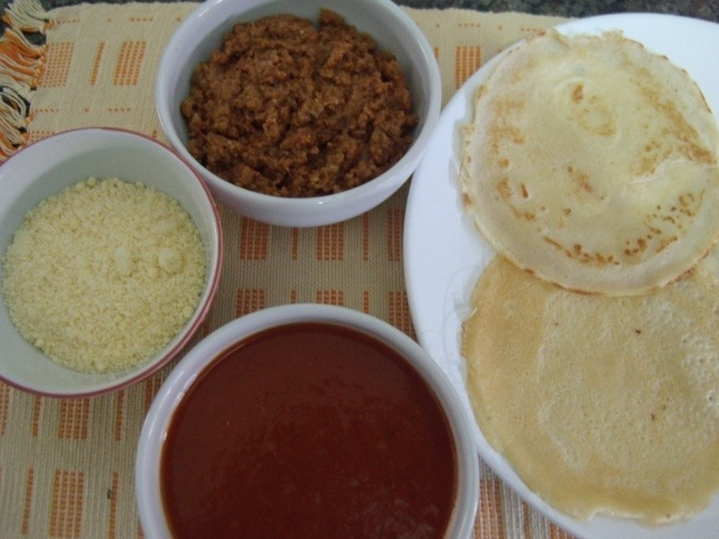 Nota: As panquecas podem ser servidas com o recheio e a cobertura de sua preferência. Podemos utilizar frango, camarão, ricota etc. A cobertura pode ser molho branco, bolonhesa, 4 queijo ou outro, contanto que combine com o recheio. O molho de tomate caseiro, você encontra nesse site.
