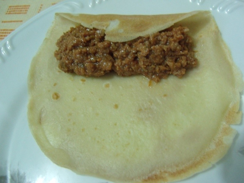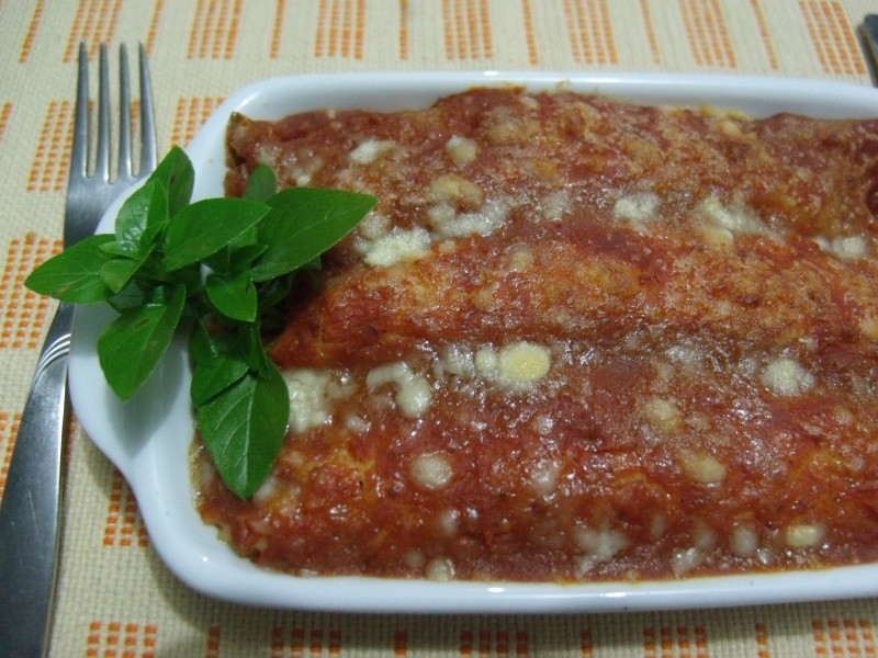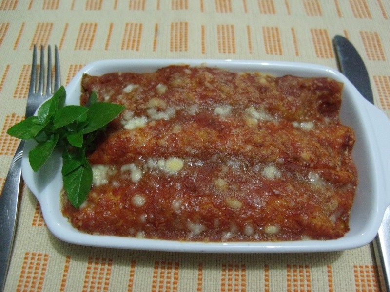 Bater todos os ingredientes no liquidificador. Untar a frigideira terfal com óleo e colocar 1 concha (de fejão) da massa, espalhando-a bem, ocupando todo o fundo da frigideira. Fritar uma a uma, até acabar a massa (as panquecas devem ficar finas). Colocar em um prato, rechear com carne moída e enrolar. Arrumar em um pirex, cobrir com molho de tomate e polvilhar com queijo ralado. Levar ao forno aquecido para gratinar (10 a 15 minutos, vai depender do seu forno) . Servir o prato imediatamente, decorado com mangericão. O acompanhamento é a gosto.