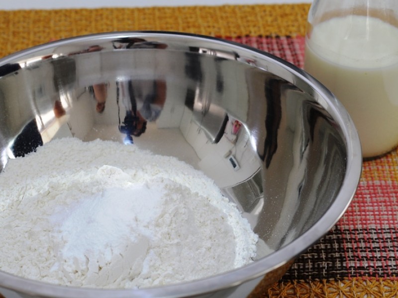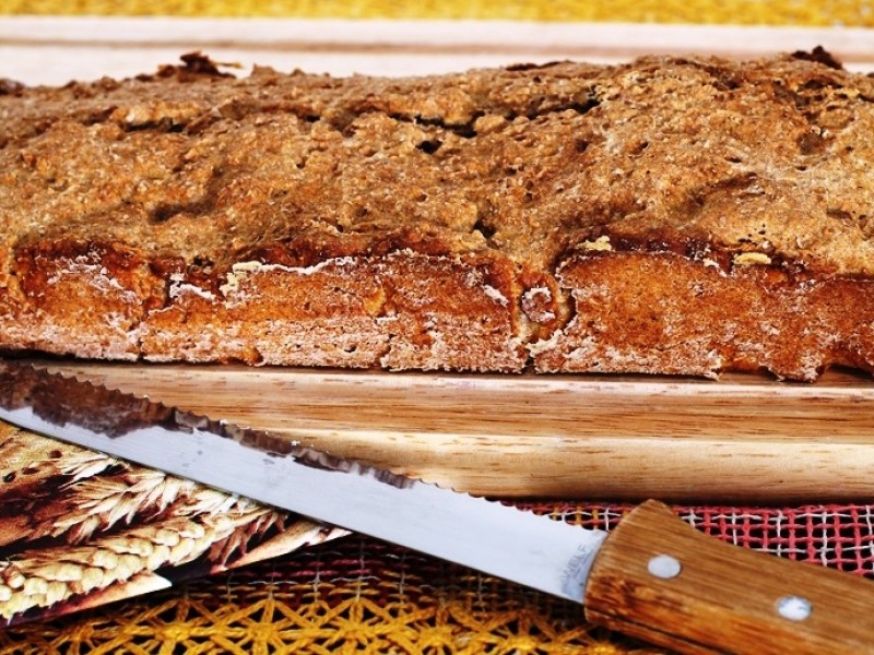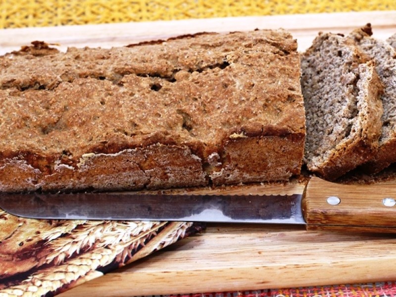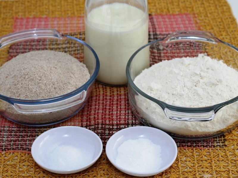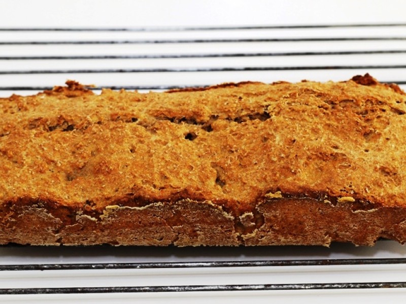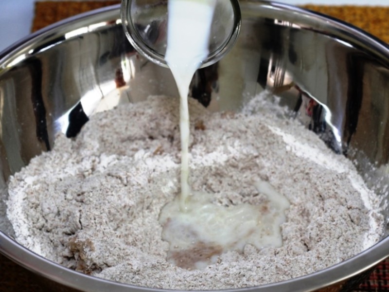 Preaquecer o forno a 200°C (temperatura média). Esperar 20 minutos até que o forno esteja bem aquecido para começar a separar os ingredientes. Reservar uma forma de bolo inglês de 22 cm x 10 cm. Untar a forma com óleo embebido em papel toalha e reservar. Em uma tigela grande, misturar os ingredientes secos e adicionar o leite aos poucos, misturando com uma espátula para incorporar bem. Mexer até que fique uma massa uniforme e um pouco grudenta. Não é necessário sovar a massa. Transferir para a forma untada nivelando a superfície com uma espátula. Com o auxilia de uma faca afiada, faça um corte no sentido do comprimento do pão, dessa maneira ele vai crescer uniforme. Levar ao forno (já preaquecido) por aproximadamente 50 min e manter na mesma temperatura até formar uma casca crocante e dourada. Desenformar e deixar em uma grelha suspensa para terminar o cozimento, dessa forma o pão não vai acumular vapor e amolecer. Após esfriar, servir com ricota caseira e geleia ou outro acompanhamento de sua preferência.