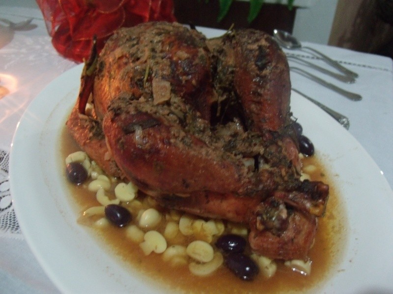 Peru de Festas, só a receita da minha mãe Nilda, que é aclamada por toda a família. Não gostamos daqueles perus sem molho e servido com farofa ao redor. Da maneira que fazemos, o peru fica com bastante caldo, pois é assado com vinho e suco de laranja, e à medida em que o fatiamos, regamos com o molho que é servido à parte em uma molheira. Delícia!!!!