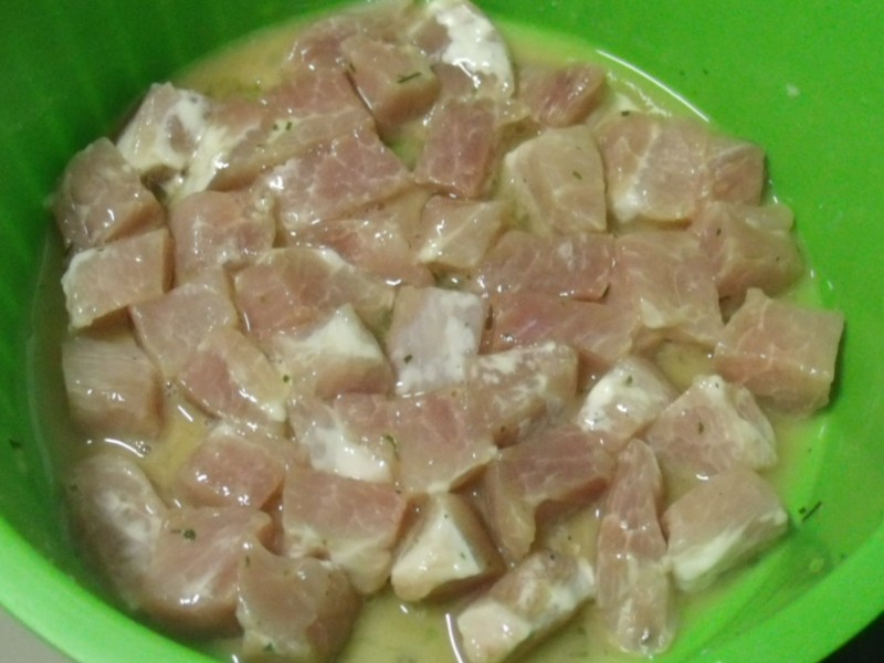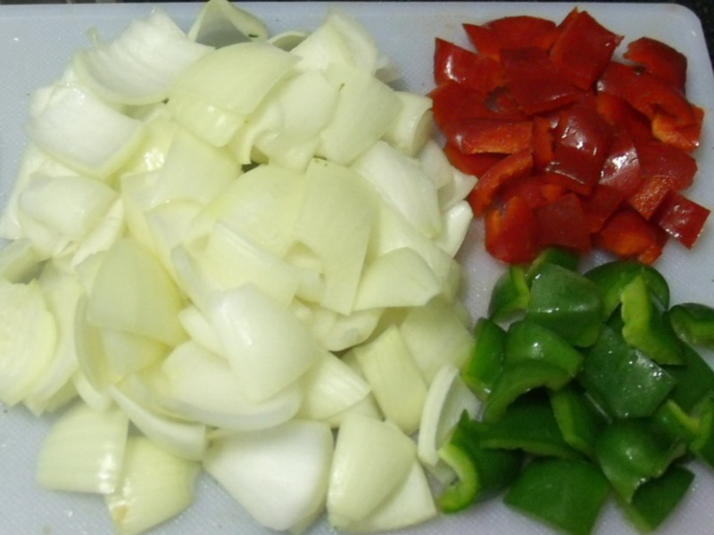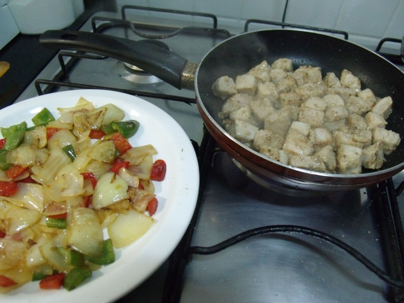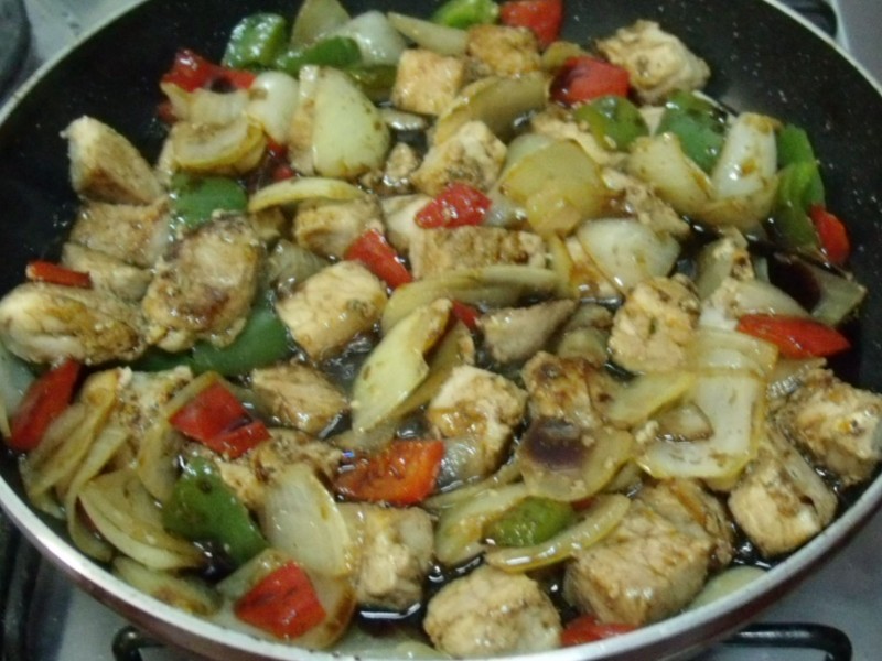 Retirar a gordura das fatias da picanha, cortar em cubinhos, temperar com sal (pouco), vinho de arroz, clara de ovo e amido de milho. Reservar na geladeira por 30 minutos, coberta com filme plástico. Em uma Wok (panela chinesa) ou em uma frigideira grande, aquecer 2 colheres de óleo e refogar os pimentões e a cebola, até essa ficar transparente. Retirar da frigideira e reservar. Nessa mesma panela, colocar mais 2 colheres de óleo, o gengibre e fritar os cubinhos de picanha suína. Quando estiverem querendo dourar, acrescantar as verduras reservadas à frigideira, misturar bem e colocar o molho de soja. Provar o sal e finalizar com o óleo de gergelim. Após uns 2 minutos, desligar o fogo e servir acompanhada de arroz refogado.