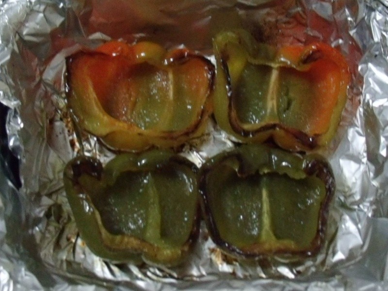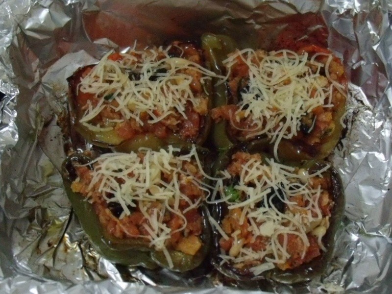 Nota: aproveitei uns pães dormidos que tinha em casa, coloquei no forninho e fiz uma farinha de pão sem desmanchar demais. Ficou ótima! Modéstia à parte, os pimentões ficaram maravilhosos!