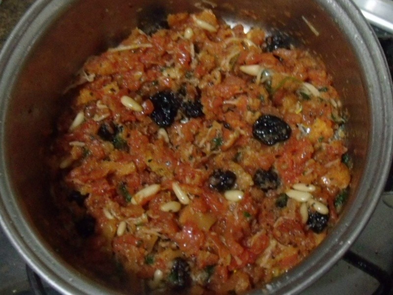 Cortar or pimentões ao meio em forma de canoa, retirar a parte branca e as sementes. Colocar em uma assadeira forrada de papel alumínio, regar com azeite e levar ao forno por 15 minutos coberto e mais 15 minutos sem o papel alumínio. Nesse meio tempo, em uma panela, colocar o azeite, refogar ligeiramente o alho e acrescentar os tomates picadinhos. Refogar mais um pouco e colocar uma pitada de açúcar, sal e pimenta do reino a gosto, o manjericão, os pinolis e as passas. Misturar bem e acrescentar a farinha de rosca e a metade do queijo ralado. Rechear os pimentões com essa pasta, regar com azeite extra virgem e o restante do queijo ralado por cima. Levar ao forno para gratinar. Servir acompanhados de pães variados bem quentinhos.