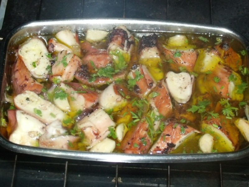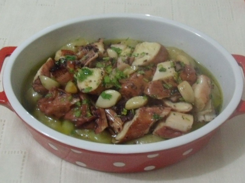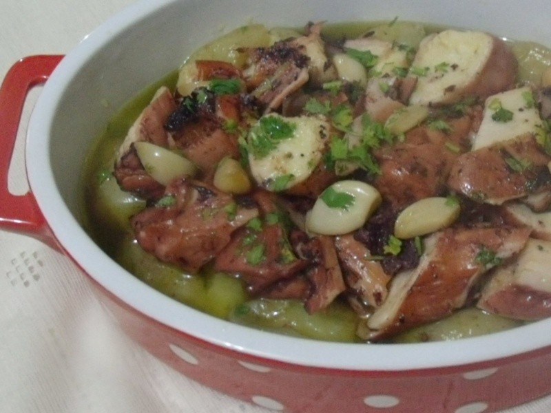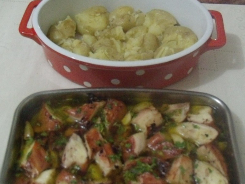 Nota: algumas receitas continham cebolas em pedaços ou em rodelas. A receita original é essa que fiz, mas confesso que na próxima vez irei utilizá-las. O pão francês molhadinho no azeite, com aquele gostinho de alho…hummmmmmm. Perfeito! Uma dica importante é levar ao forno as batatas e o polvo ao mesmo tempo, para que fiquem prontos juntos, pois o azeite deve estar muito quente ao ser servido.