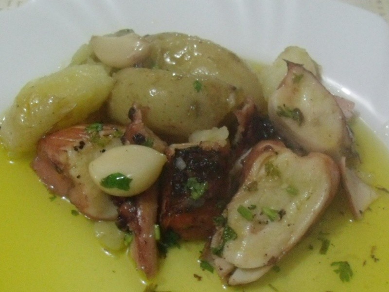 Nota: algumas receitas continham cebolas em pedaços ou em rodelas. A receita original é essa que fiz, mas confesso que na próxima vez irei utilizá-las. O pão francês molhadinho no azeite, com aquele gostinho de alho…hummmmmmm. Perfeito! Uma dica importante é levar ao forno as batatas e o polvo ao mesmo tempo, para que fiquem prontos juntos, pois o azeite deve estar muito quente ao ser servido.