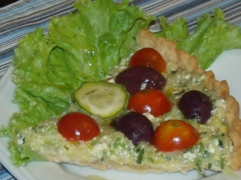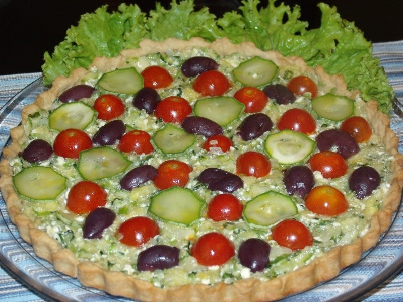 Refogar os miolos da abobrinha e o alho-poró no azeite, alho e cebola. Acrescentar a salsa, a cebolinha, os queijos e o creme de leite. Colocar esse recheio sobre a massa, e sobre ele, os tomatinhos e as azeitonas pretas. Levar ao forno para gratinar. Servir imediatamente.