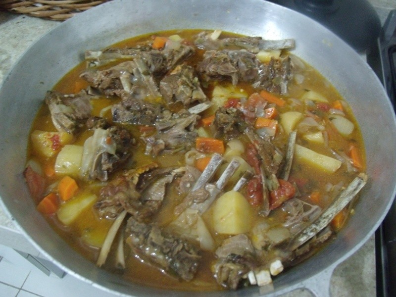 Colocar o carneiro em água com os limões e deixar por 1 hora. Escorrer (sem lavar) e temperar com alho, cebola roxa, cheiro verde, vinho branco seco, sal e pimenta do reino a gosto. Levar ao fogo uma panela grande (usei a minha de pressão de 12 l) com o azeite e fritar o carneiro. Quando ele começar a dourar, polvilhar a maizena e fritar mais um pouco. Acrescentar o restante dos ingredientes, tampar a panela e cozinhar por 1 hora se for na pressão, caso use uma panela comum, cozinhar em fogo baixo até amolecer a carne e os legumes. Servir com arroz refogado.