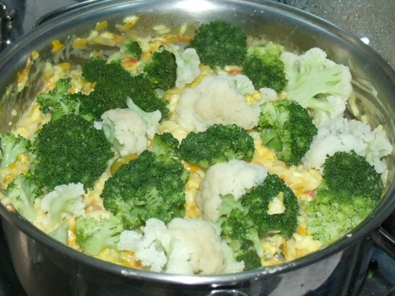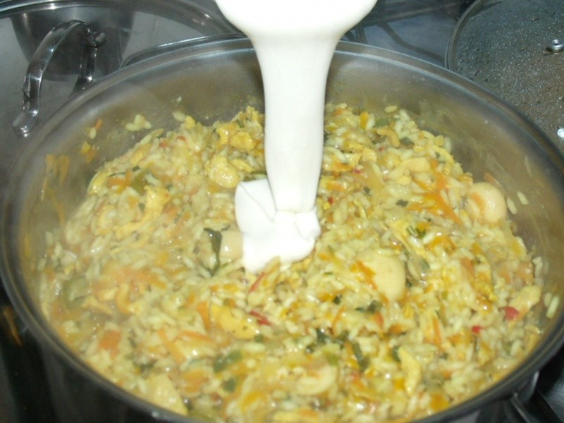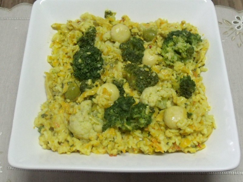 Temperar o frango com alho, sal, açafrão e pimenta-do-reino a gosto. Reservar. Cozinhar os buquês de couve-flor e brócolis no vapor e branquear (choque térmico). Reservar. Levar ao fogo uma panela com o azeite e refogar a cebola. Acrescentar o frango temperado, refogar um pouco e em seguida incorporar o arroz. Refogar. Adicionar o tomate, o pimentão, a batata, a mandioquinha, a cenoura, a abóbora e o cheiro verde. Mexer e acrescentar o vinho branco. Deixar evaporar um pouco e acrescentar a água. Tampar e deixar cozinhar. Ainda com o arroz bem molhado, colocar as azeitonas, os cogumelos e em seguida, a manteiga e o queijo ralado. Mexer levemente e incorporar o requeijão. Misturar bem e por último, colocar os buquês de brócolis e couve-flor. Servir imediatamente.