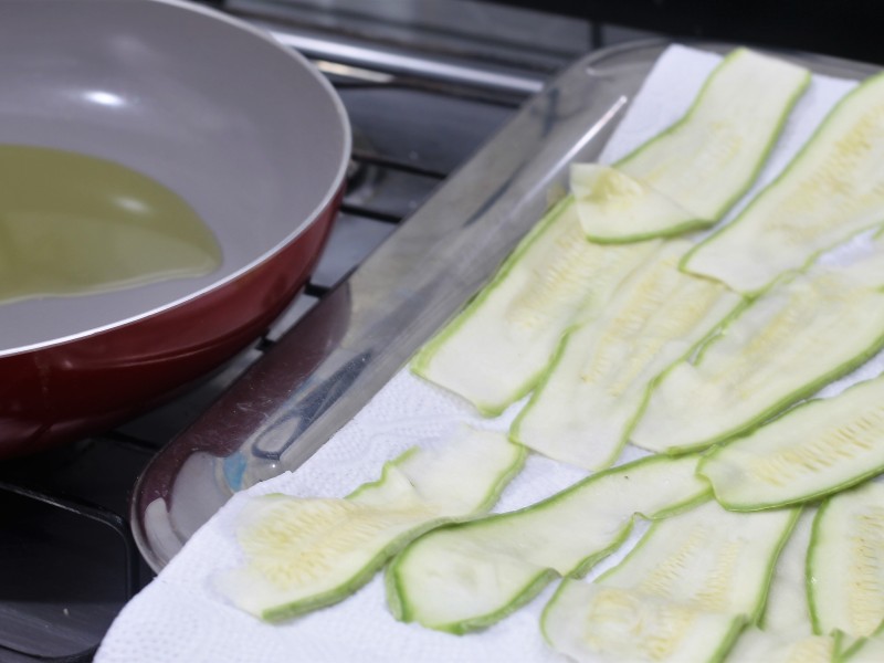 Fatiar as abobrinhas com o auxílio de um fatiador de legumes (pode ser com uma faca amolada), colocar numa peneira, polvilhar com sal e deixar desidratando por 10 minutos. Lavar e escorrer bem Pode usar o papel toalha sem demorar muito para não dissolvê-lo. Levar ao fogo uma frigideira grande antiaderente e colocar uma colher de azeite. Fritar ligeiramente as fatias de abobrinha sem sobrepor. Utilizar mais azeite sempre que necessário. Escorrer ligeiramente em papel alumínio. Colocar uma colher de chá de cream cheese na ponta de cada fatia e enrolar como rocambole. Em um prato, dispor os rolinhos em pé e acrescentar uma metade de tomate cereja e uma folha de manjericão em cada um. É uma entrada bonita, fácil de preparar e deliciosa!