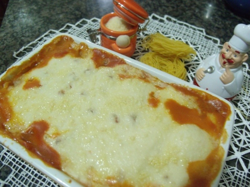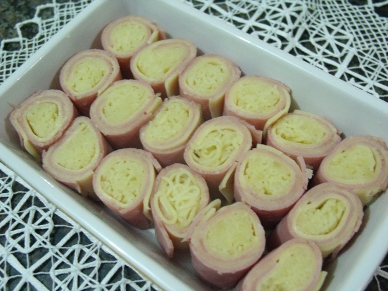 Cozinhar o macarrão “al dente”, escorrer e reservar. Fazer rolinhos da seguinte maneira: uma fatia de presunto, sobrepor uma de queijo e em uma das extremidades, colocar uma porção de macarrão. Enrolar como rocambole, cortar ao meio e arrumar os rolinhos em pé num pirex refratário. Cobrir com o molho de tomate e por cima deste, o molho branco. Polvilhar com o queijo ralado e levar ao forno para gratinar. Servir acompanhado de torradas.