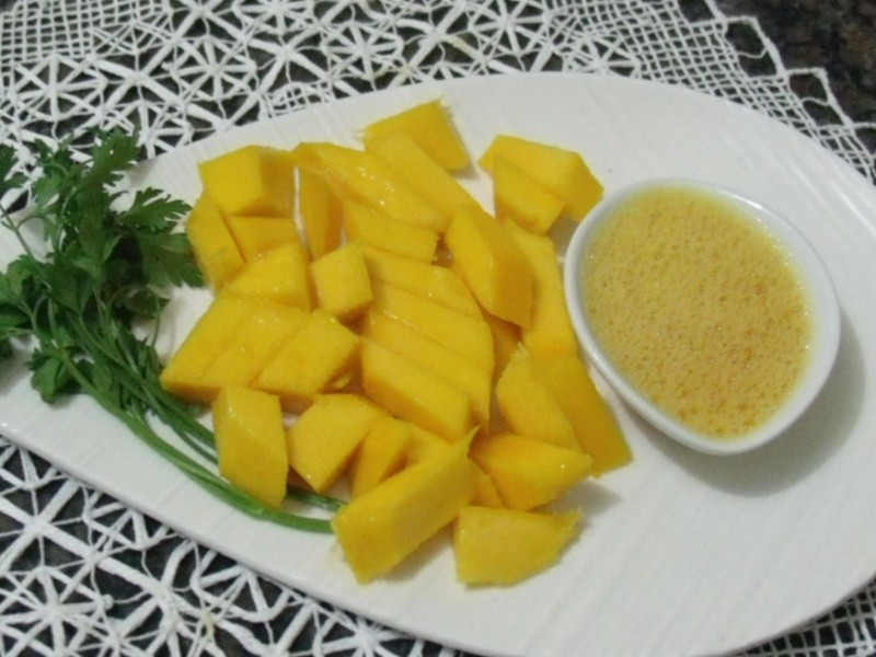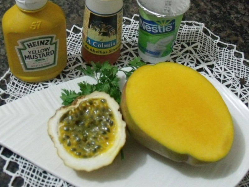 Colocar no hipoclorito as folhas de alface, as de manjericão e a salsa por 30 minutos. Escorrer, lavar em água corrente e reservar. Em uma peneira, espremer a polpa do maracujá com uma colher, para obter um suco grosso, sem adição de água. No liquidificador, colocar o iogurte, o suco do maracujá, o mel, o creme de leite, o sal, a mostarda e as folhas de manjericão. Bater bem e colocar na geladeira. Em um prato apropriado, arrumar as folhas de alface intercalando as cores, dispor no centro a manga cortada em cubos e regar com o molho de iogurte. Salpicar a salsinha picada e está pronta uma salada simples e saborosa!