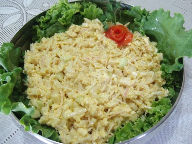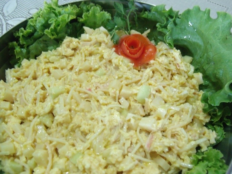 Desfiar o kani e partir as tirinhas ao meio. Colocar em um recipiente e adicionar o palmito cortadinho, o creme de leite fresco, as mostardas, o suco de limão, a maçã descascada e cortada em cubinhos e sal a gosto. Misturar tudo e levar à geladeira. Servir sobre folha de alface.