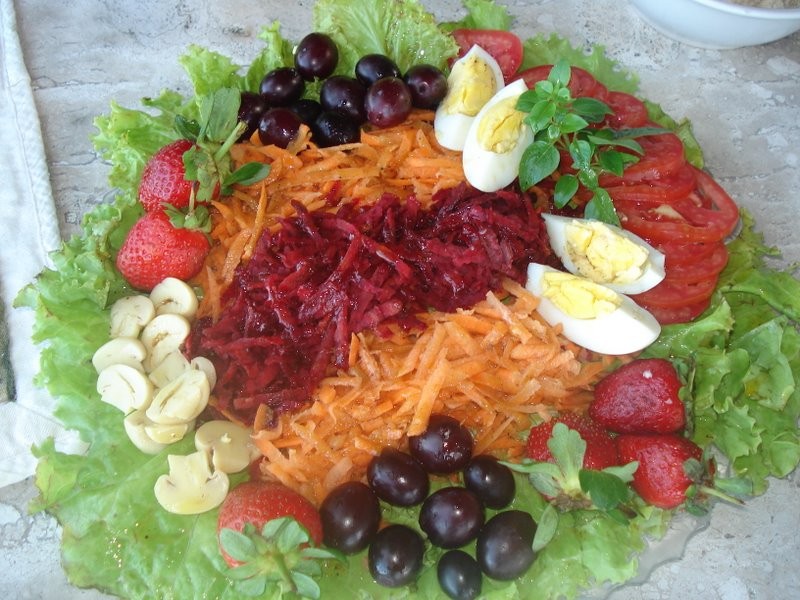 Lavar todos os ingredientes em água corrente, deixar de molho na água por 20 min e depois no hipoclorito por mais 20 min. Após descascar as beterrabas e raspar a casca da cenoura, ralar as duas separadamente e cortar os tomates em rodelas. Dispor em um prato apropriado as folhas de alface, a beterraba e a cenoura ralada, os morangos, os cogumelos fatiados, os tomates em rodelas, as uvas, os ovos cozidos e por cima, folhas de manjericão (que tenho em uma caqueira no meu terraço). Regar com o molho francês, se a salada for servida imediatamente, caso contrário, sirva em uma molheira.