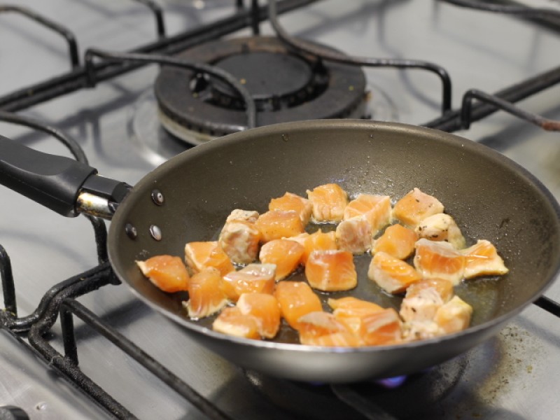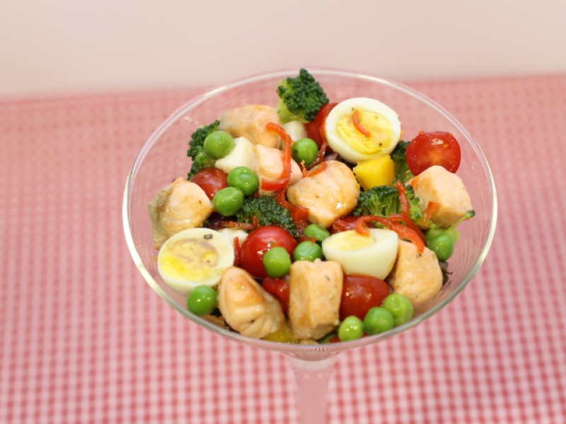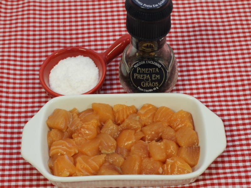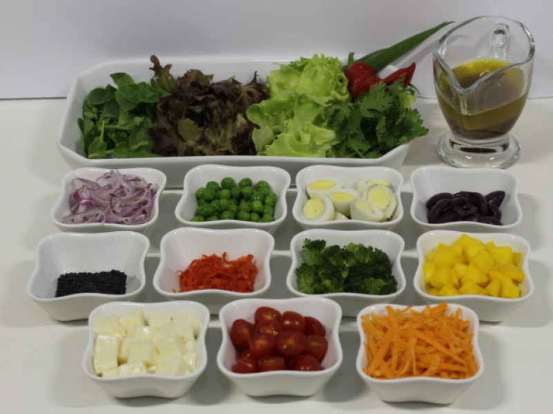 Colocar em uma tigela todos os ingredientes do molho, misturar bem e tranferir para uma molheira. Reservar. Temperar os cubos de salmão com sal e pimenta-do-reino. Levar ao fogo uma frigideira com azeite e fritar ligeiramente o salmão. Reservar. Montar a salada em duas taças começando pelas folhas. Acrescentar os demais ingredientes com a preocupação de deixar a taça bem colorida. Os ovos e os cubos de salmão devem ficar por cima. Regar generosamente com o molho reservado e salpicar o gergelim preto. Aguarde os elogios!