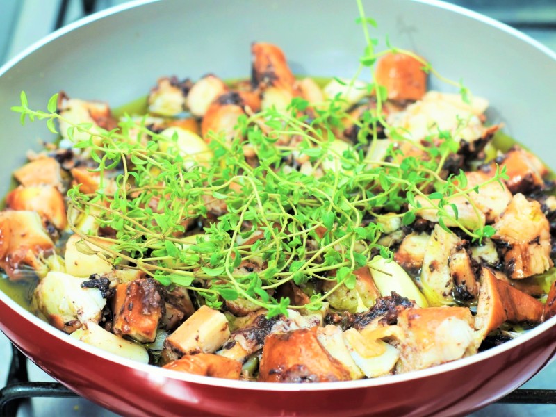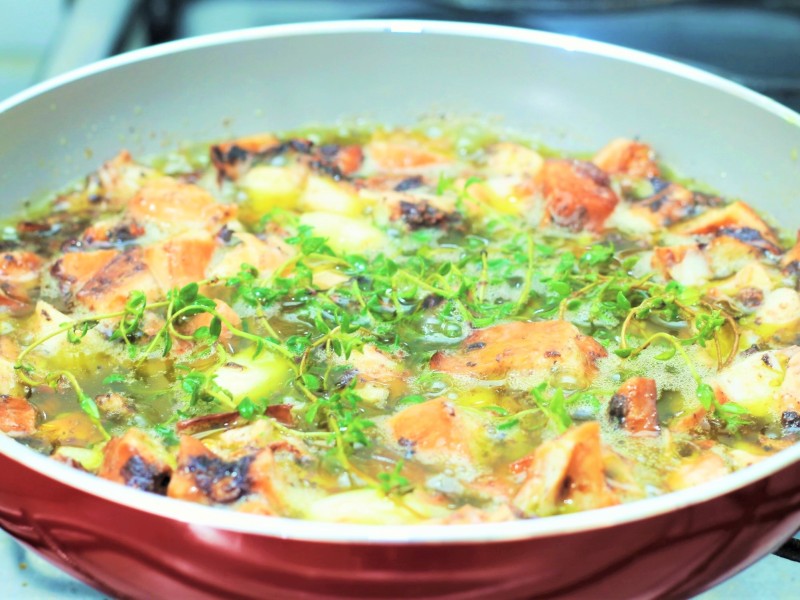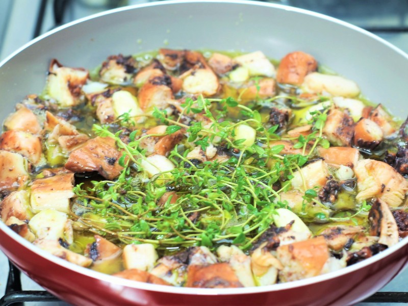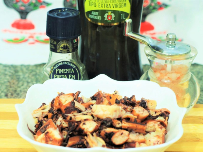 Nota: após o cozimento na panela de presão, o polvo foi confitado, ou seja, cozinhado lentamente no azeite em baixa temperatura, com alho e tomilho, o que o deixa aromatizado e com a textura macia.