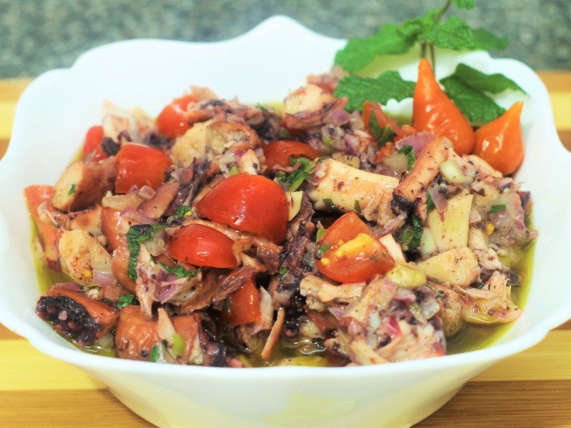 Colocar o polvo em uma panela de pressão com 2 copos de água e 1 cebola inteira. Cozinhar por 40 min contando à partir do momento em que a panela começar a chiar. Deixar a pressão sair naturalmente, retirar o polvo da panela e colocar em um recipiente com um pouco de água e gelo para interromper o seu cozimento (2 minutos). Escorrer, cortar em pedaços pequenos e reservar. Levar ao fogo uma panela com o azeite e os dentes de alho machucados com casca. Quando aquecer, colocar o polvo e o tomilho. Cozinhar em fogo baixo (confitar) por 15 minutos aproximadamente. Descartar os dentes de alho e o tomilho. Colocar o polvo em uma saladeira e Incorporar os dentes de alho picados, a cebola roxa, os tomatinhos, a pimenta dedo de moça, o suco de limão e o hortelã picado. Misturar tudo e temperar com sal e pimenta-do-reino moída na hora. Regar com azeite extra virgem e decorar com pimenta biquinho e ramos de hortelã. Servir acompanhada de torradas.