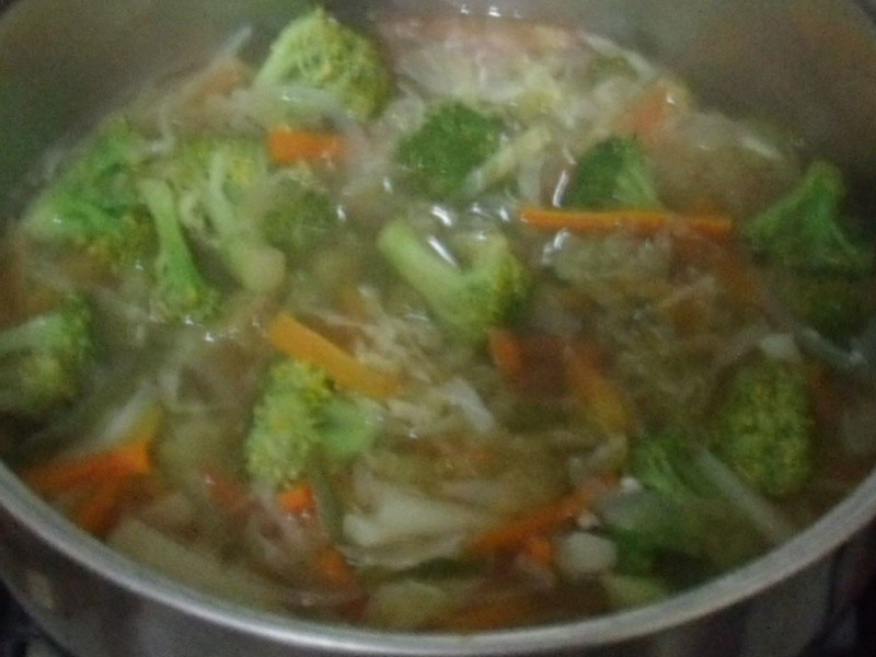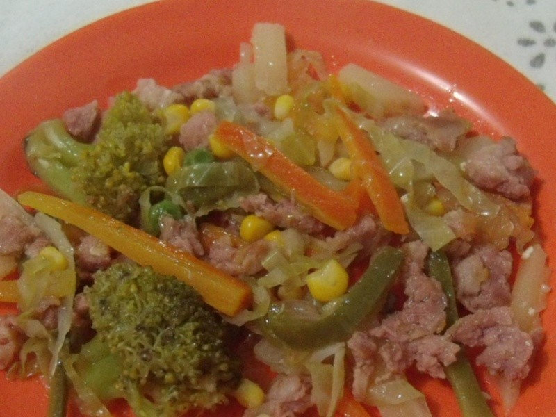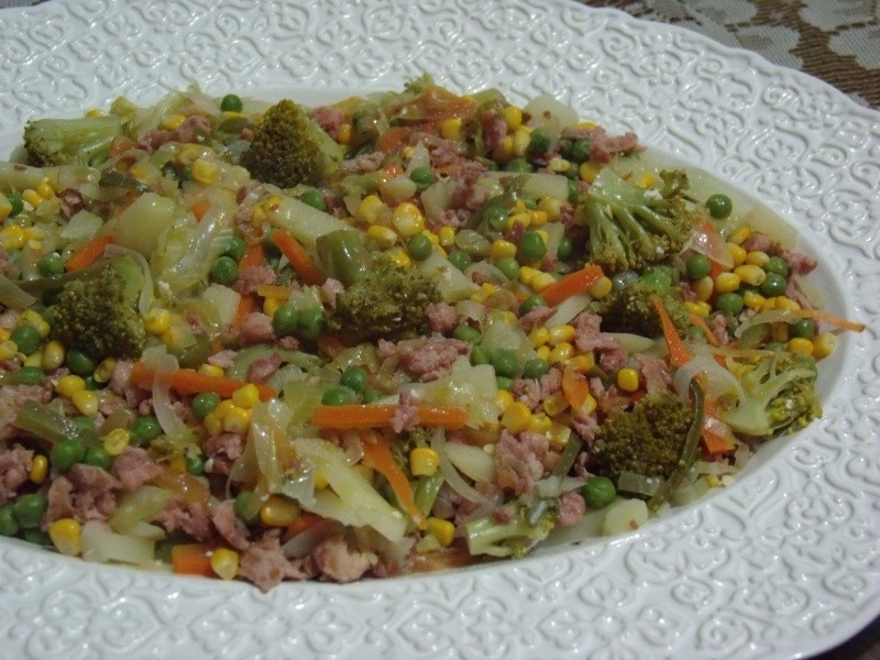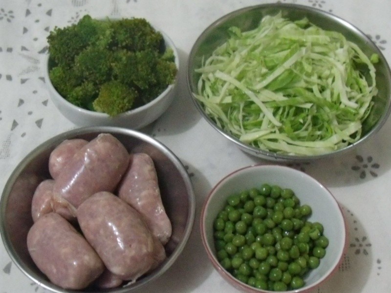 Levar uma panela grande ao fogo e cozinhar as linguiças por 5 minutos contados após a fervura. Retirar com uma escumadeira e conservar a água. Retirar a pele das linguiças e desmanchá-las com um garfo. Reservar. Cortar a batata e a cenoura em palito finos, a cebola, os tomates, o repolho e o pimentão em tirinhas e separar os buquês do brócolis. Cozinhar tudo na água das linguiças, incluindo as ervilhas frescas, até que as batatas e a cenoura estejam bem macias (coloquei antes as batatas e a cenoura por 10 minutos e só depois acrescentei o restante). Em uma frigideira antiaderente, fritar as linguiças (sem adição de gordura) por 10 minutos. Escorrer a água do cozimento das verduras, acrescentar as linguiças misturando com cuidado e levar à uma travessa grande. Incorporar o milho verde, regar com bastante azeite extravirgem e servir imediatamente. Sucesso absoluto!