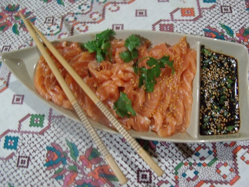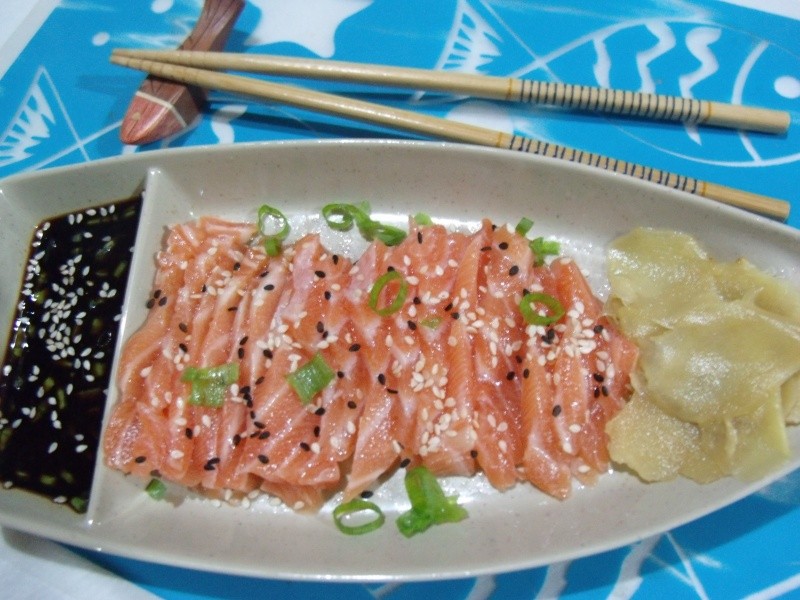 Limpar bem o salmão, retirando a pele e as espinhas. Fatiar com um corte firme (sem fazer o corte para frente e para trás), e arrumar em um prato apropriado. Misturar o shoyu, o wasabi, o gergelim (preto e branco) e a cebolinha verde. Servir o gengibre à parte.
