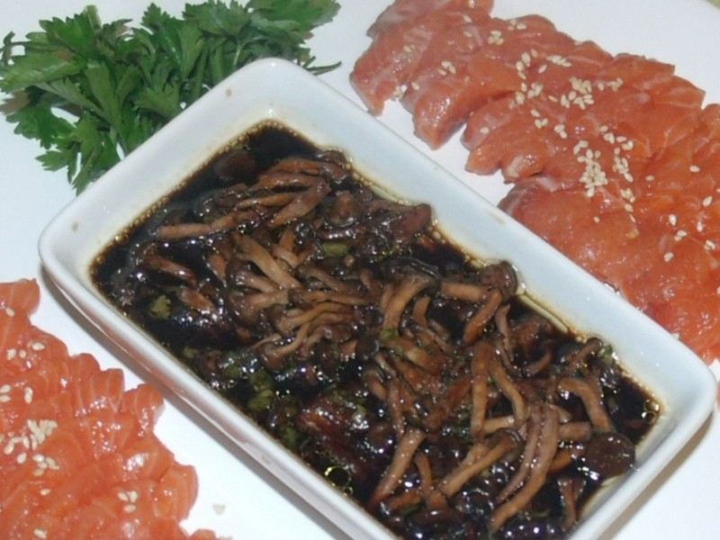Nota: Fatiei finamente 300 g de salmão fresco, no sentido contrário às fibras. Servi com gergelim torrado acompanhando o shimeji. Também costumo fazer um molhinho de shoyu, wasabi, gergelim e cebolinha para acompanhar o salmão, se este for o prato principal. Nesta receita que fiz, não tinha cebolinha em casa. Usei salsinha, mas não é a mesma coisa. A cebolinha é indispensável.