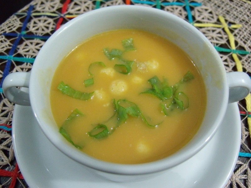 Em uma panela grande, refogar as cebolas na manteiga. Acrescentar a abóbora, as batatas e as cenouras (tudo picadinho). Refogar mais um pouco e colocar a água. Tampar a panela e cozinhar em fogo baixo até ficar tudo bem macio. Passar no liquidificador e voltar ao fogo. Enquanto isso, misturar bem o queijo ralado com as gemas e fazer pequenas bolinhas (como se estivesse fazendo docinhos). Quando o caldo começar a ferver, incorporar de uma vez as bolinhas de queijo. Deixar o tempo suficiente para que elas cozinhem. Salpicar cebolinha e servir com torradas.